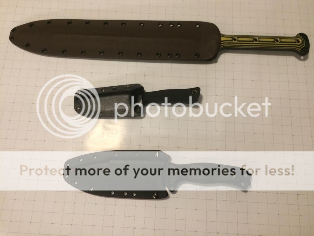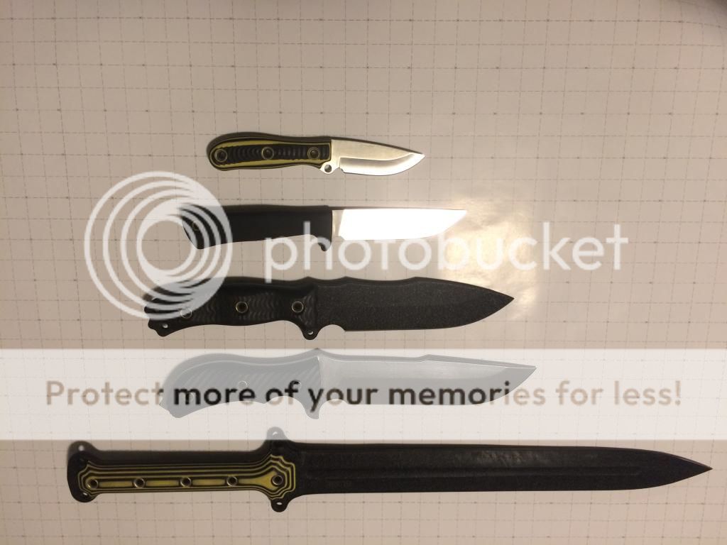 4) Gladius. INFI steel black blade with black and yellow G10 handles. Used by previous owner. Has a little coating wear In the sweet spots. Comes with kydex sheath ....Withdrawn!!!