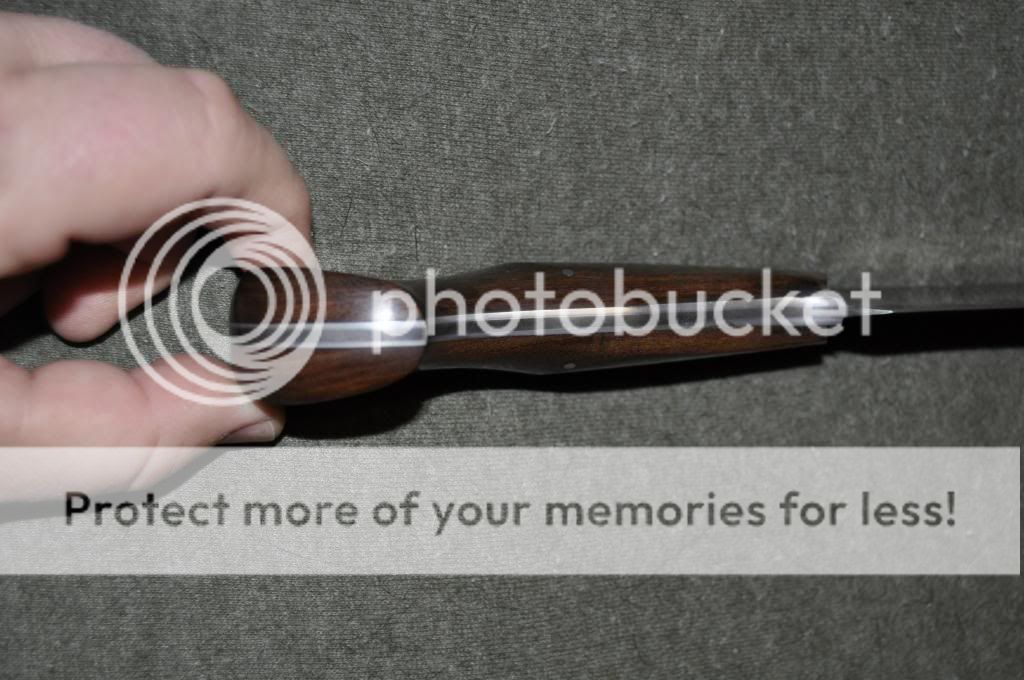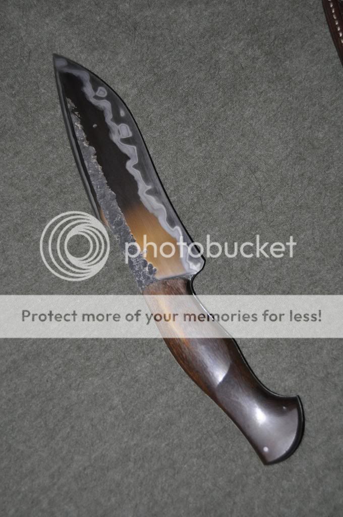 CAS Laminated Camp. Beautiful laminated blade. San Mai 420/1095, 7-1/2" sharp blade (a bit of recurve, distal tapered handle), 12-3/4"" overall (0.260" thick), Sharpened Clip. Guayacan beautifully curved handle. Very nice rt-hand carry sheath.
