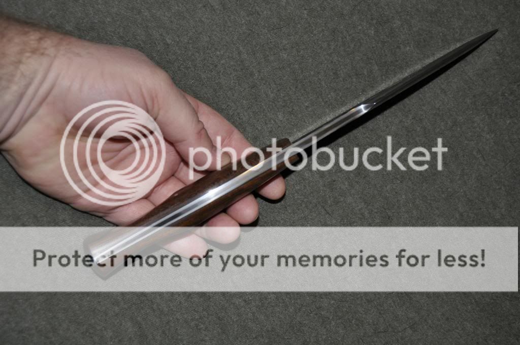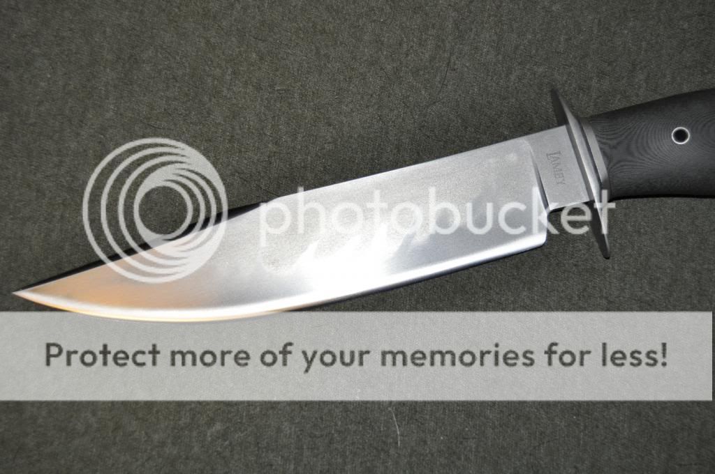 Matt Lamey Bowie/Fighter. Beautiful blade w/Hamon and handle. Bead blasted anti-glare finish. 1095FG (I believe... could be W2), 8-3/4" sharp/ 9" blade, 14" overall (0.25" thick), Sharpened Clip. Bead Blasted Gray/Black Micarta handle and spacer. SS Guard. Very nice rt-hand carry sheath.