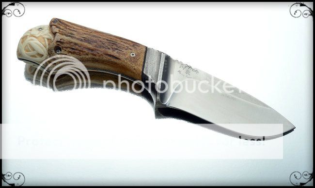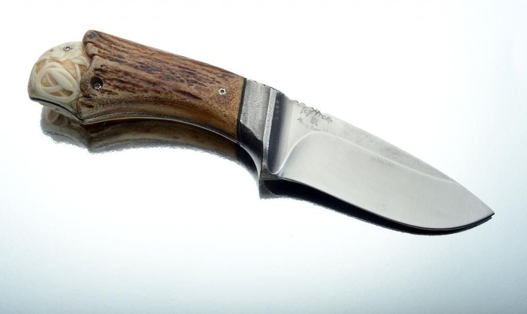 This is an old skinner by Pierre Reverdy (AKI member), from France. I was not 100% satisfied with the original handle and had a new one made (sculpted antler). Here's the knife :