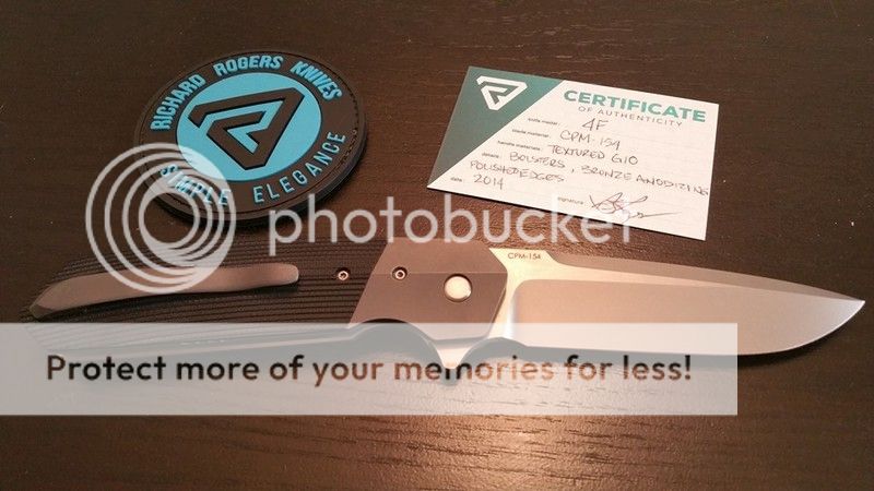 So here she is. 4F in textured g10, 3 & 3/4 blade. and what looks more like blasted bolsters. The card recently acquired from sally says bronze but they are more grey color. Only one very small almost unnoticeable snail trail I'll try and photo later. Can only be seen in perfect light at an angle (genuinely hardly noticeable just wanted to be 100% clear). Knife card and case, 900 net shipped! Offered here and on Richards Facebook group first I'll take it gets it.