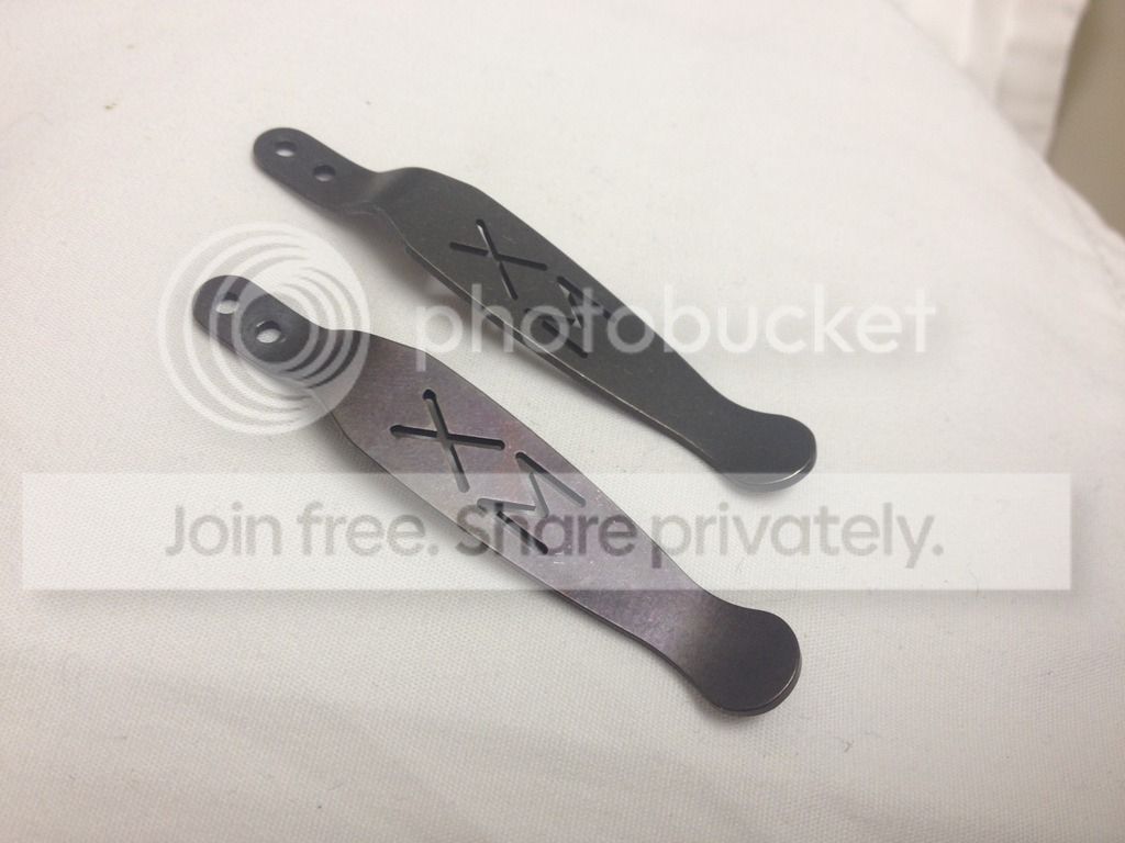 I have two Hinderer Knives clips for sale that fit the XM series knives and the Eklipse model. One is a Battle Bronze finish and the other is a Bronze anodized clip. Both are like new, only installed for pics and to see what they look like. Both finishes are out of stock right now.