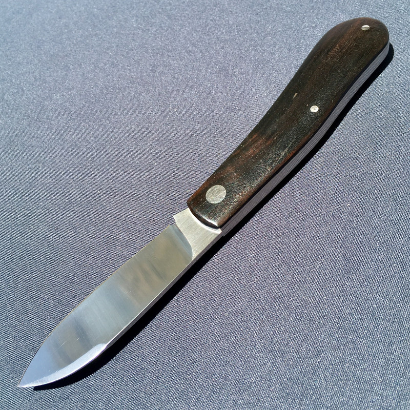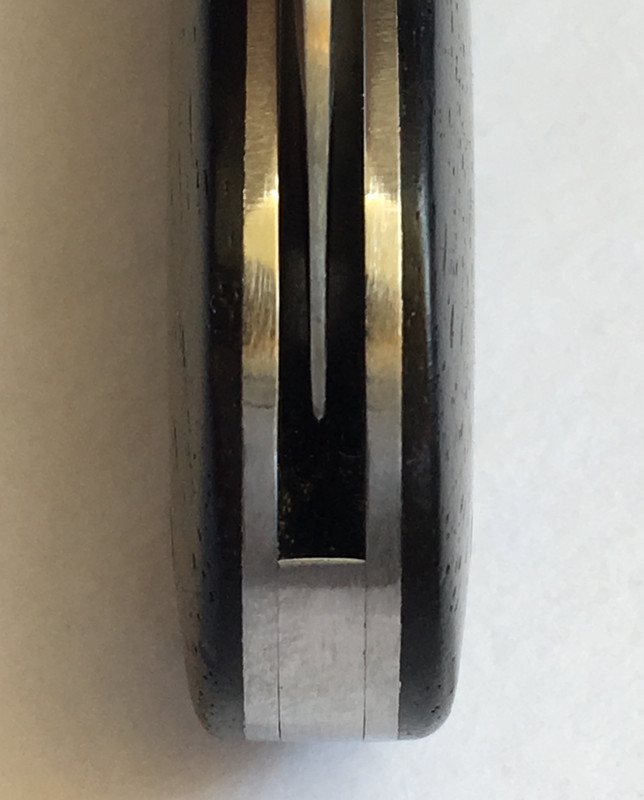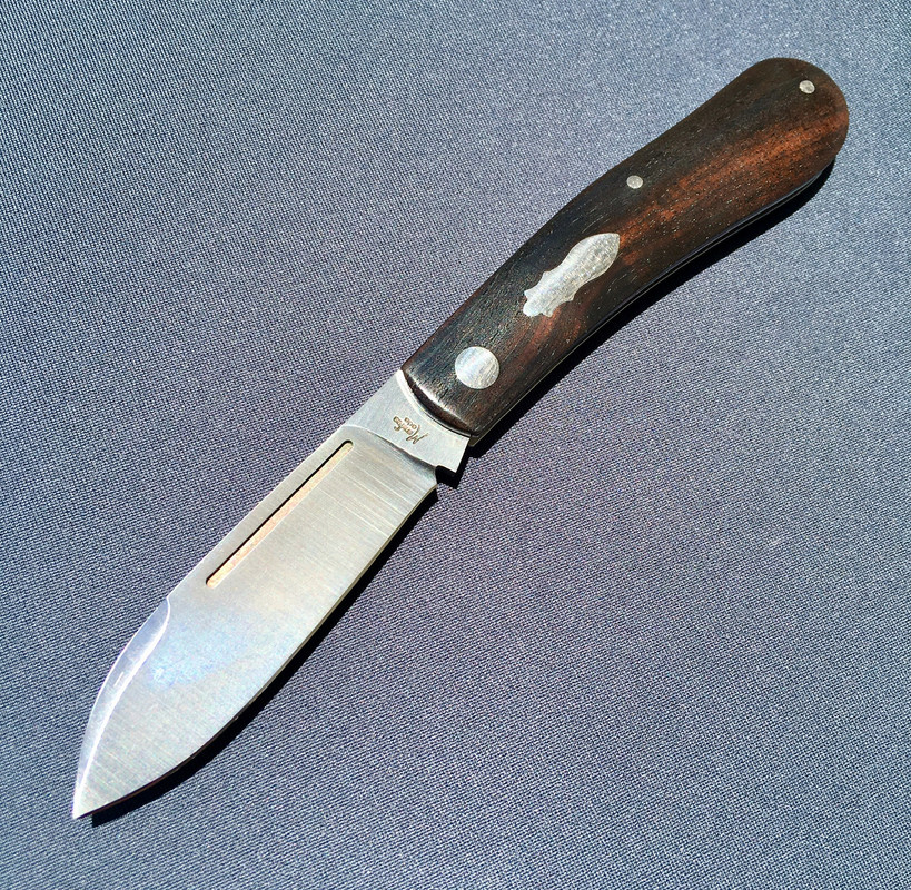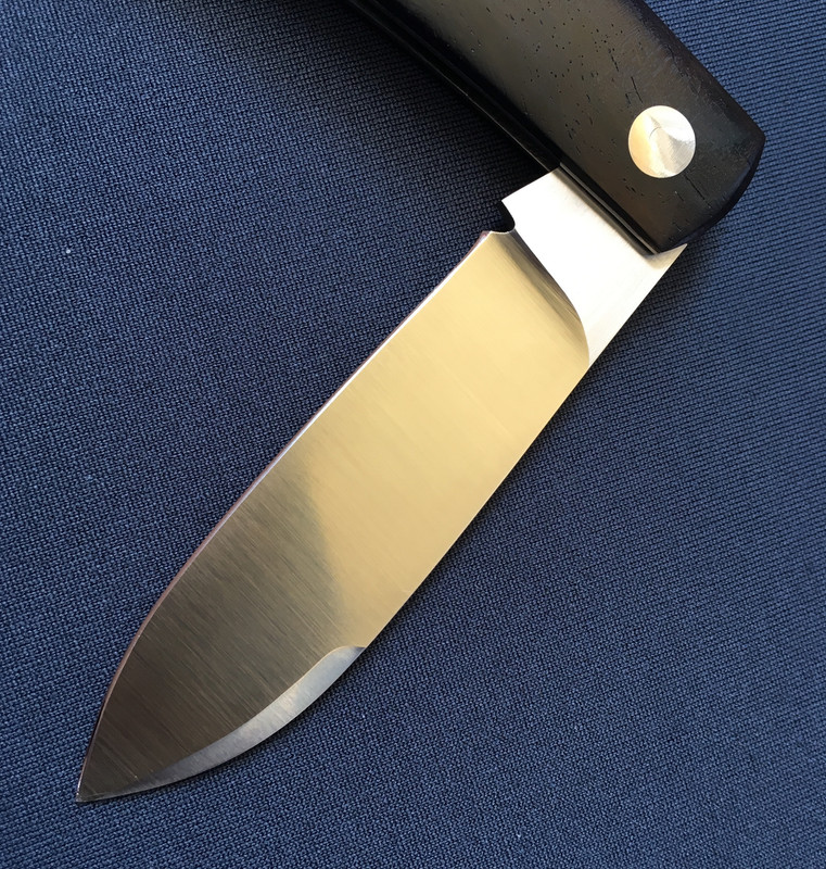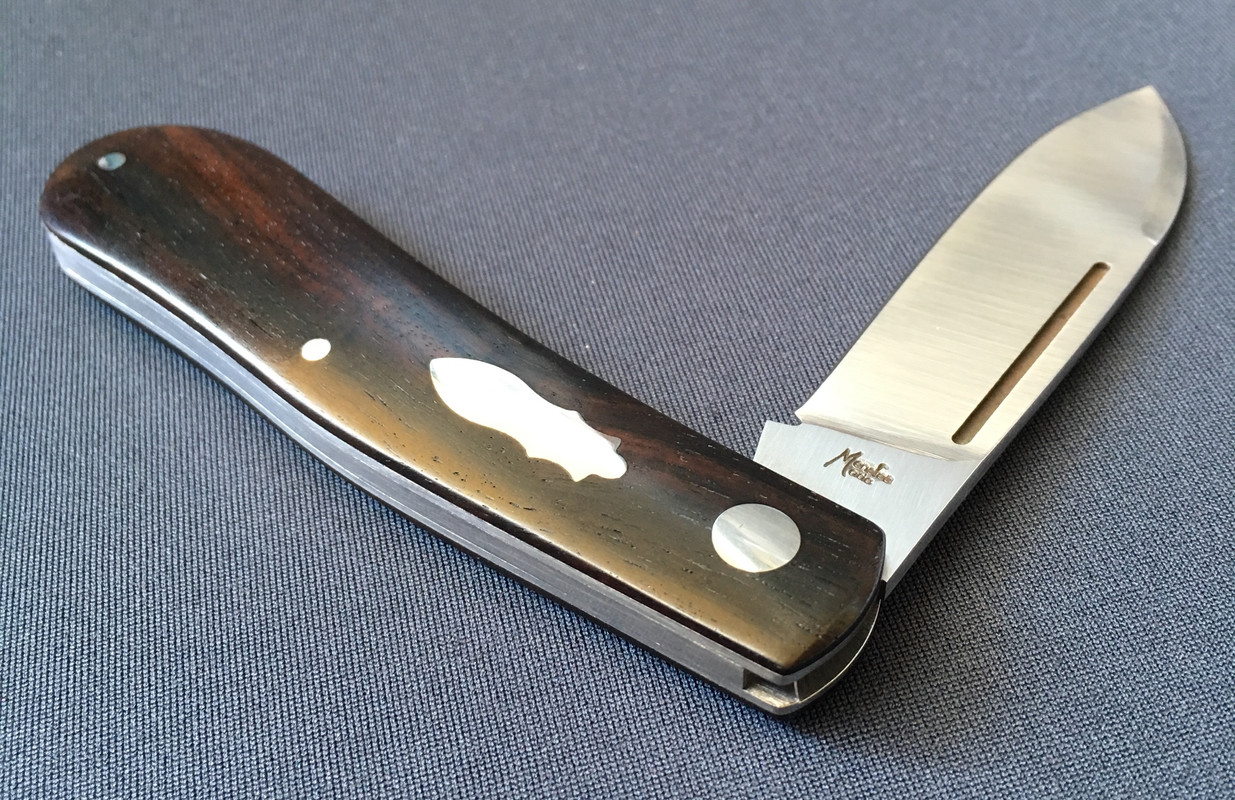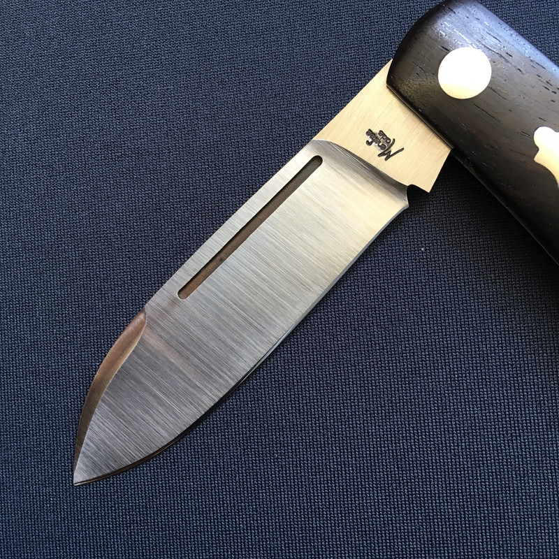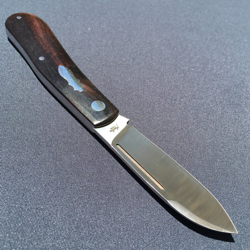 For sale is a Rick Menefee 3 3/4” dogleg shadow in African Blackwood. I’m the original owner, it has been carried and so very lightly used to open mail. Not sharpened and still hair popping sharp. Blade is hollow ground and thin, what Rick is known for. Normal pocket swirls but blade is perfect and centered when closed. Pretty much close to new condition. Strong snaps, closing snap is slightly softer but still great action overall. Spring and liners are flushed at close, half stop and open position. I’ve owned a few knives from Rick and this one has the best fit and finish. No light gaps between liners and spring. No trades please. $315 SOLD shipped in a padded zipper pouch via USPS priority mail insured. Paypal goods and services. CONUS only. Please PM me for Paypal info. Thank you!