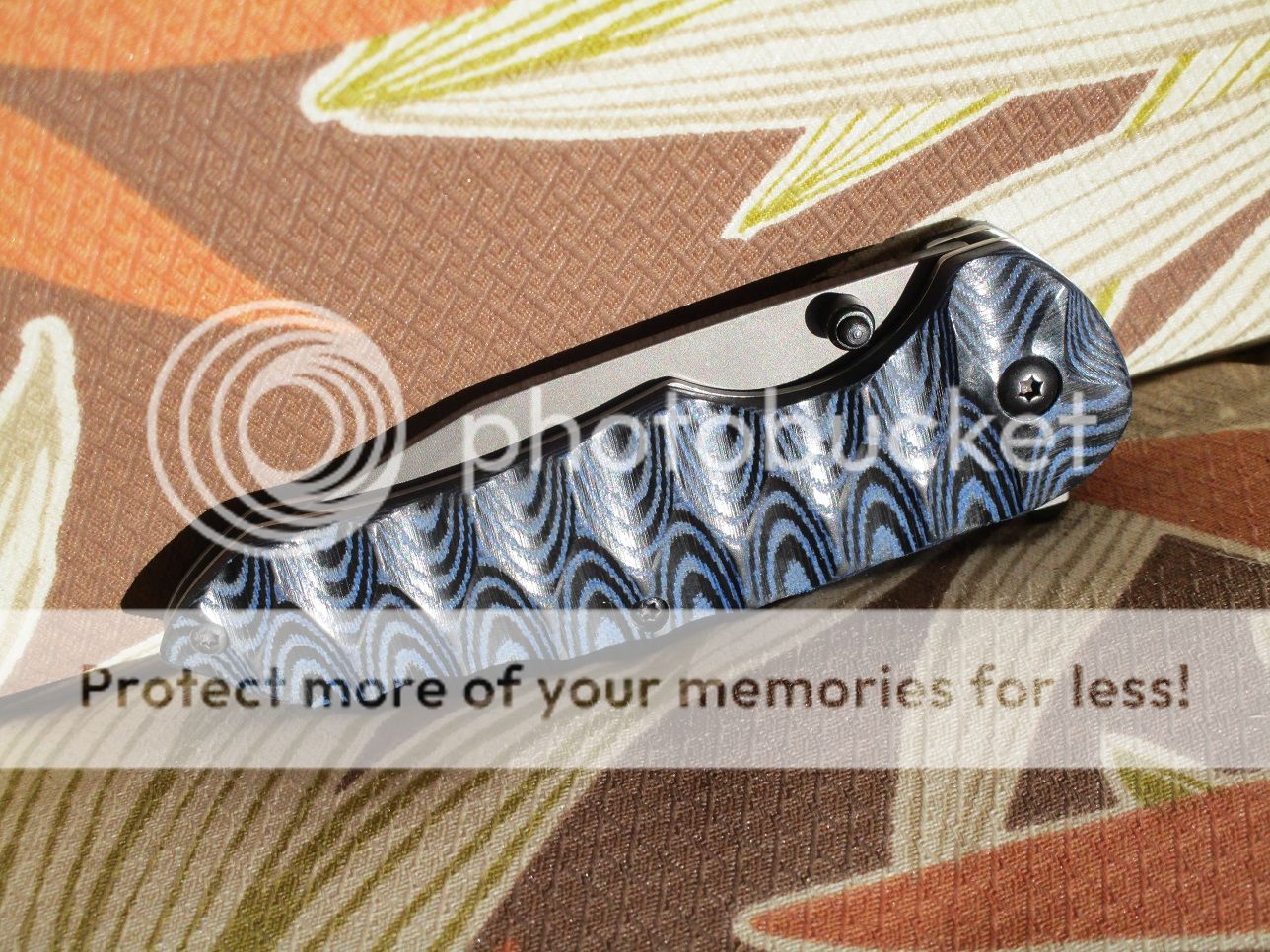 Then I had to go back and buy the fiberglass handle tanto. I hate tanto blades, especially combo edged ones. Then to add that thumb stud. But again for the price I'm not in the luxury of being picky. The pattern on the handles is very close to the blue Benchmade 300. Blade is supposed to be titanium coated.