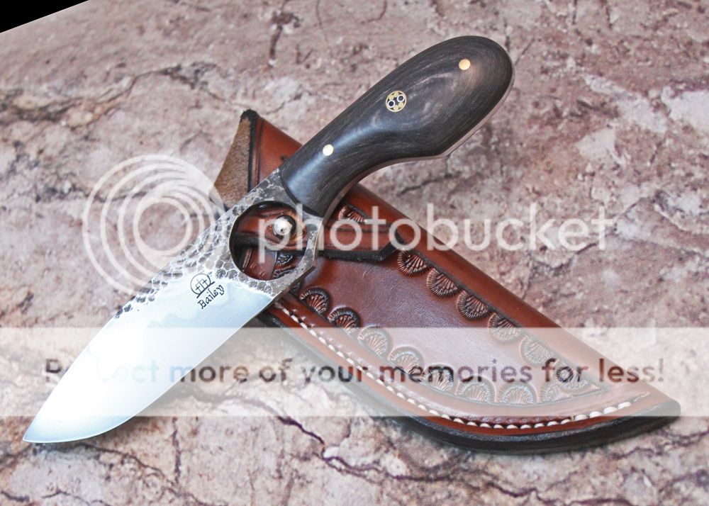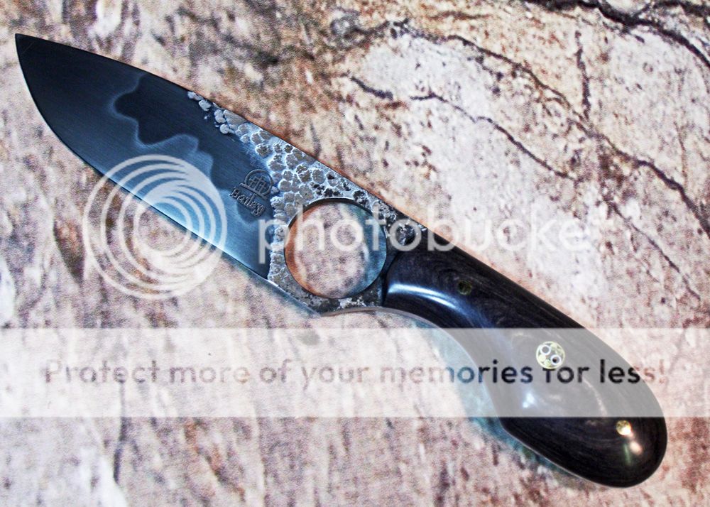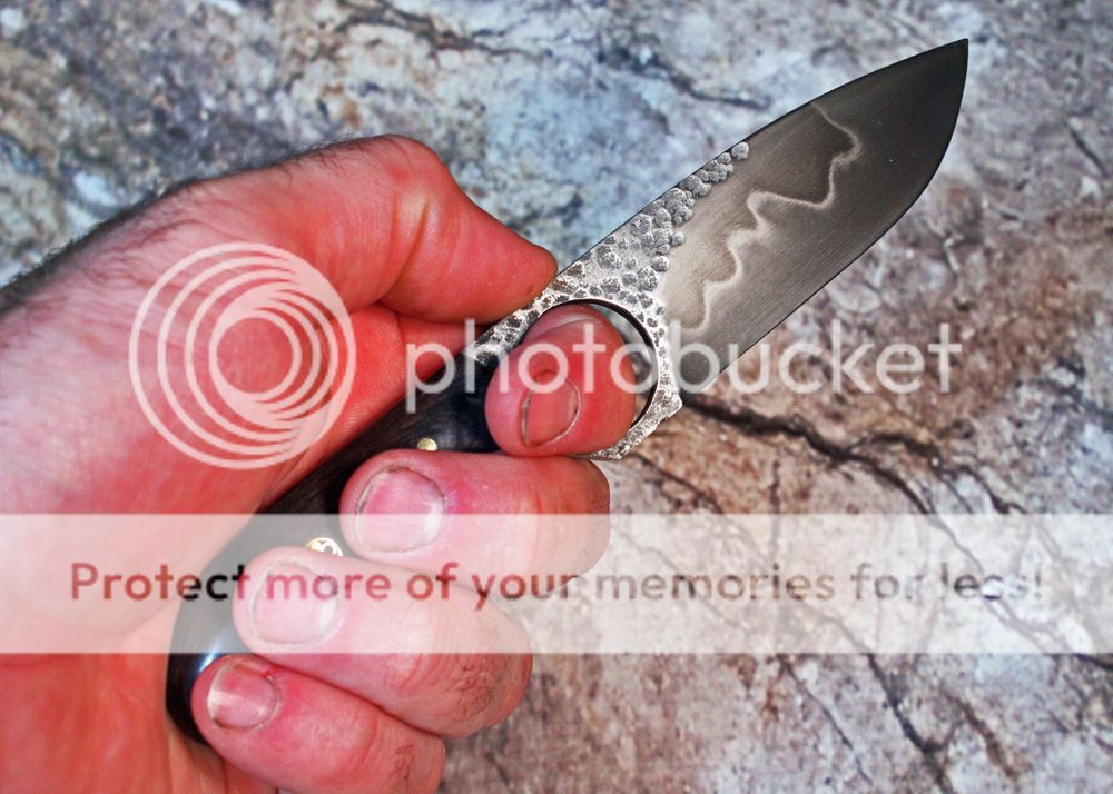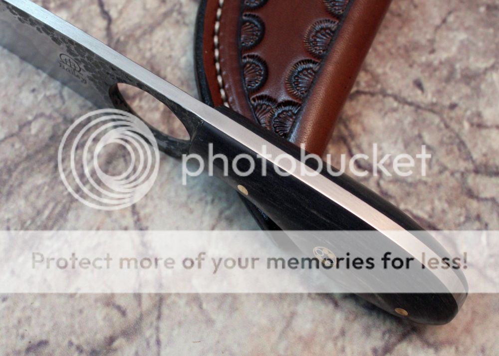 OK, I rarely name my knives, because I can never think of any good names. This name was given by one of the first customers for this type of knife so it kind of stuck. Anyways, I haven't made any of these in a while, but found some steel I had drilled the hole in quite a few years ago so I made this. It was ground on my rotary platen for a slight convex grind. It was clay quenched for a nice hamon and polished to 2000 grit to bring out the details.
