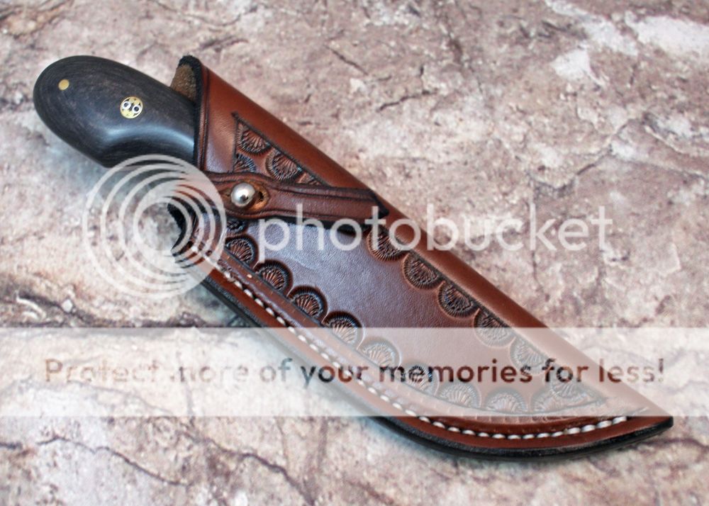 The sheath is 7-8oz hand tooled leather from Wickett and Craig. It has a keeper strap that holds the knife in nicely.