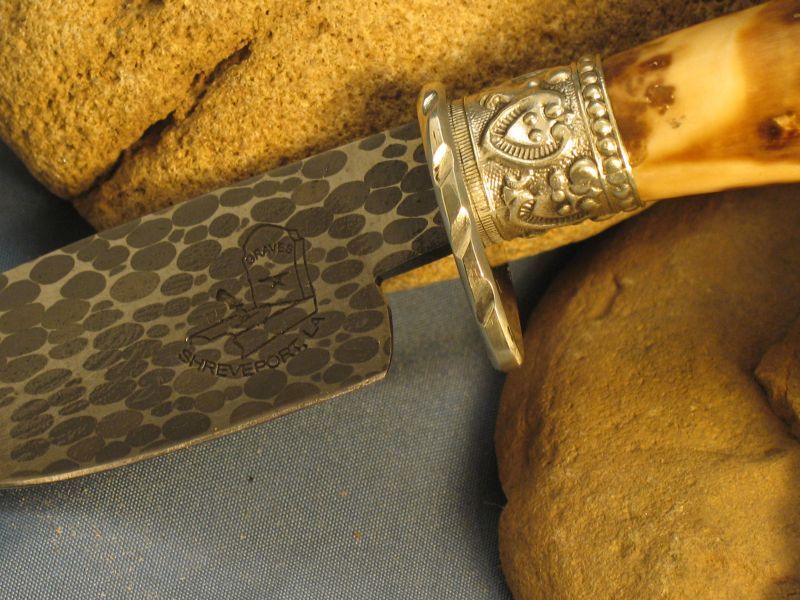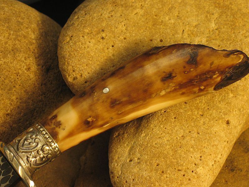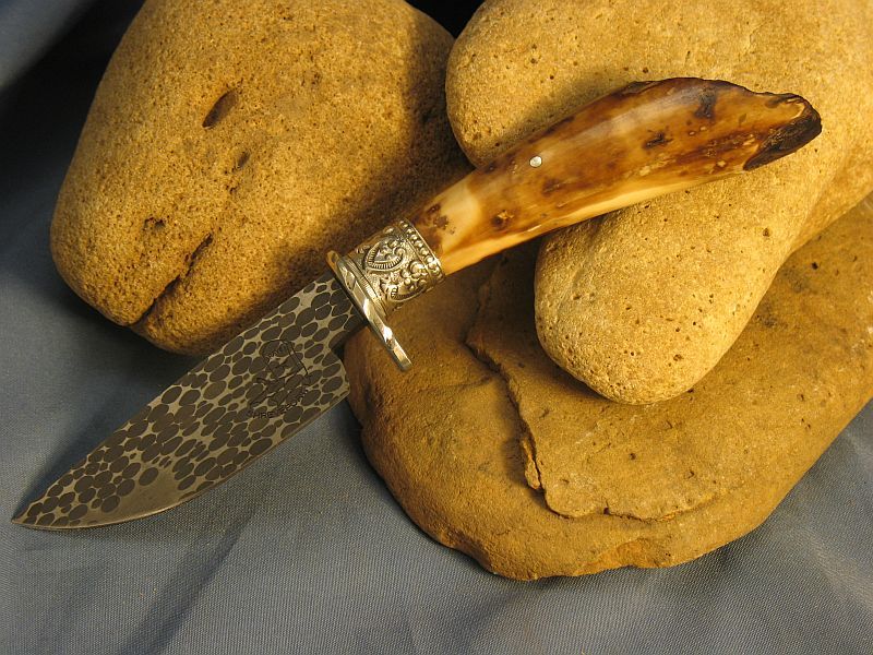 This is a new one I just completed. Now specs on it Fossil Walrus ivory , nickel silver, sterling silver ferrule and my Damascus of 52100 ball bearings and 4600 E powder steel. The balls started as 1/8 dia. The handle is a nice tusk tip with natural end as it came out of the ground and was a hide scraper tool used by Inuit Indians many centuries ago. VERY SHARP and this steel should be about 59 to 60 on rockwell scale. Blade length is 3 3/8 inches and overall length is 7 1/4 inches. Nice leather belt sheath included. Any questions please ask. SOLD and 6.00 priority mail in USA. My e-mail and paypal is dangraves4923@earthlink.net And Yes, I Hope you like it as much as I enjoyed making it.