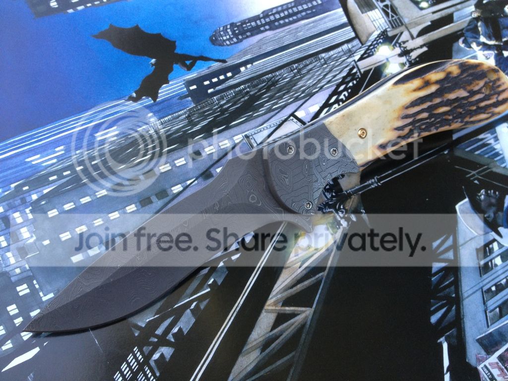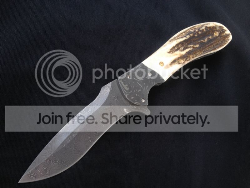 RJ Martin Variable in mint condition with Chad Nichols damascus blade and bolsters. Perfectly mated amber stag with orange peel liners. Perfect detent produces smooth flipping action.