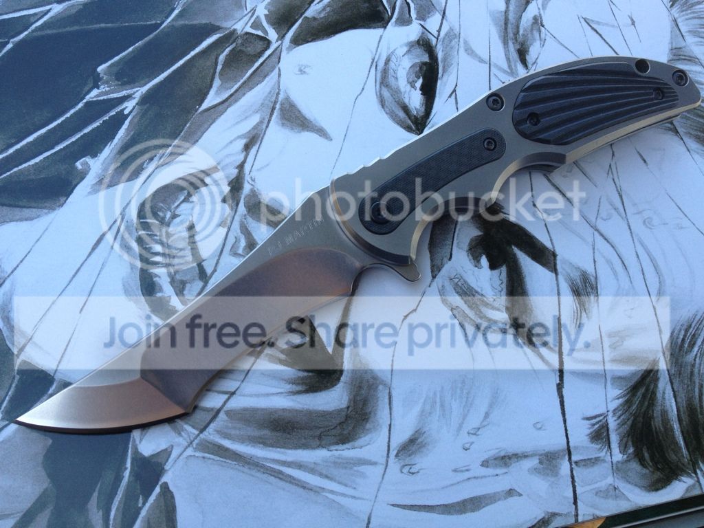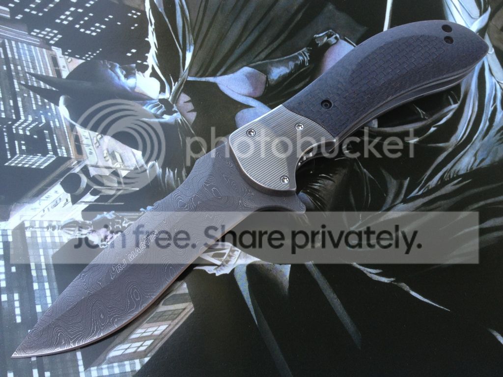 RJ Martin Variable with damascus blade and lightning strike carbon fiber handle in mint condition. Back spacer is G10 and bolsters and liners are titanium. Fluted bolsters with orange peel sides.