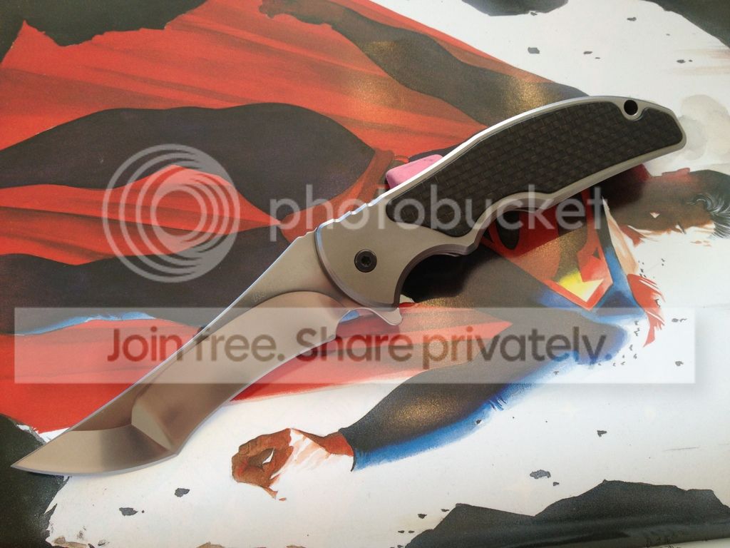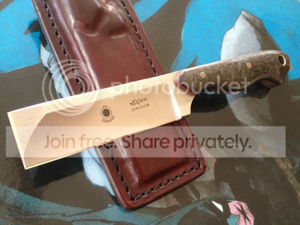 Jon Graham Razel. This Razel has some beautiful thick carbon fiber handles and some red liners with mosaic pins. The extra thickness provides comfort and looks. The knife has been carried and very lightly used and only shows the faintest of marks. Has Graham's sharp edge and has not been used since he sharpened it. Comes with dyed leather pocket holster.