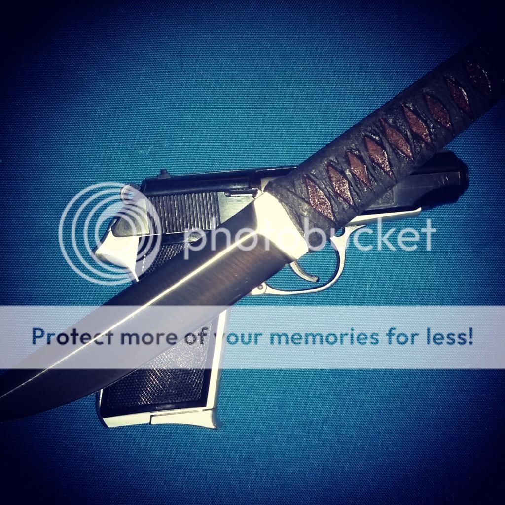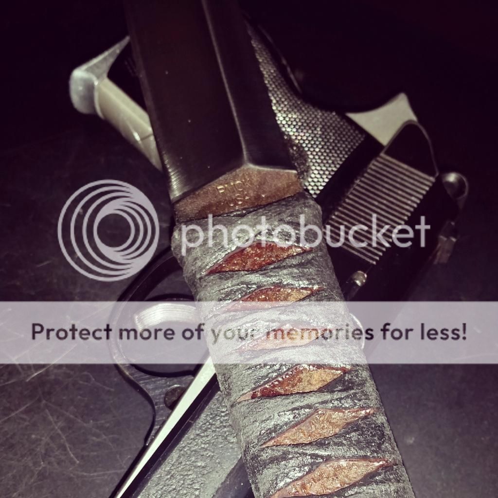Full tang with brown leather wrapped in black cotton cord, soaked in epoxy