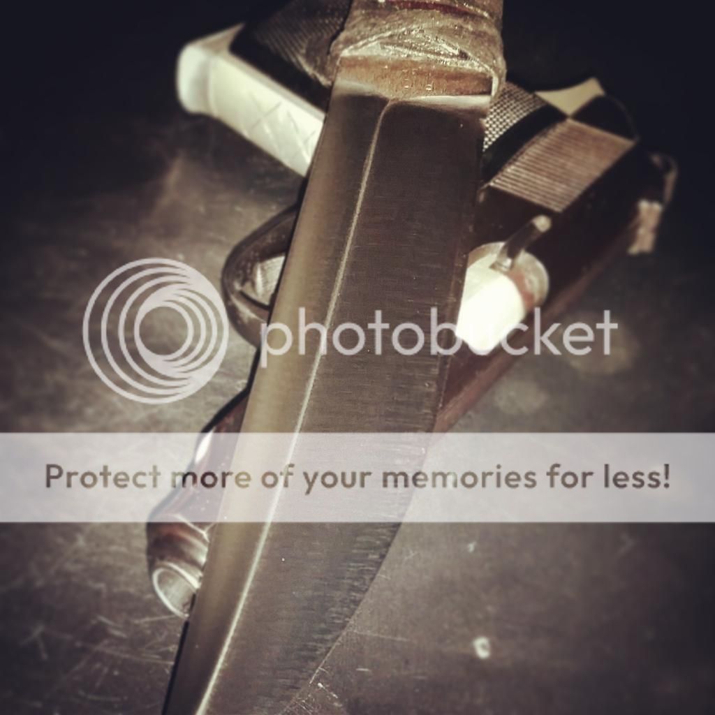 Blade is .285" thick but still hair shaving sharp, and handle is a full tang with brown leather wrapped in black cotton cord, then soaked in epoxy.