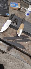 I've decided to work on all five knives at the same time or at least for most of the steps. I will not post each step from each knife because it will be repetitive. I will try however to capture all the steps of the way. I'm pointing this out because you may notice different knives from one step to another or different finishes written on the blades and might be confusing.