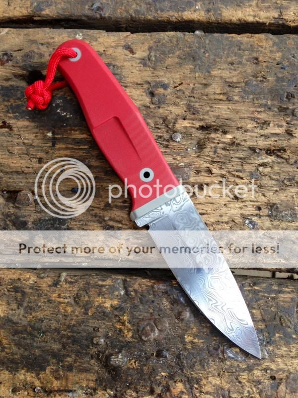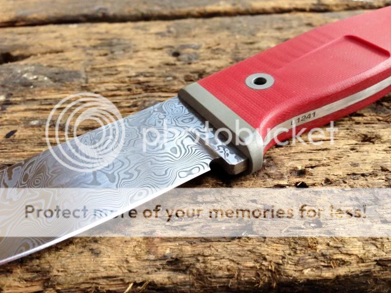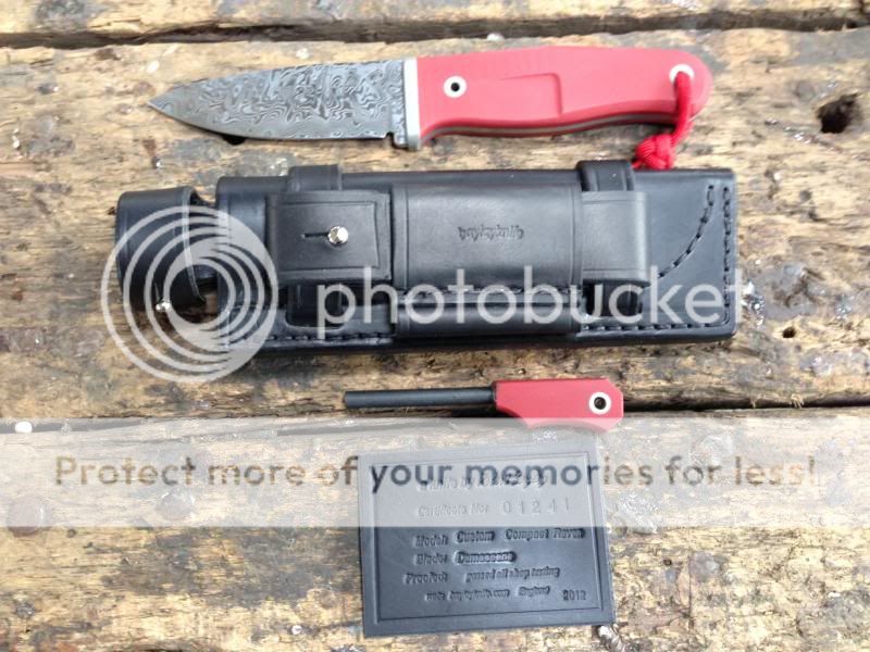 The knife, #01241, is a custom Compact Raven, custom in as much it had the stainless Damascene (Damasteel) blade and obviously the red G10 scales, as the photos also show it is offered in it's original black sheath, that complete with an unused red G10 Bayley made fire steel and original leather certificate of authenticity...