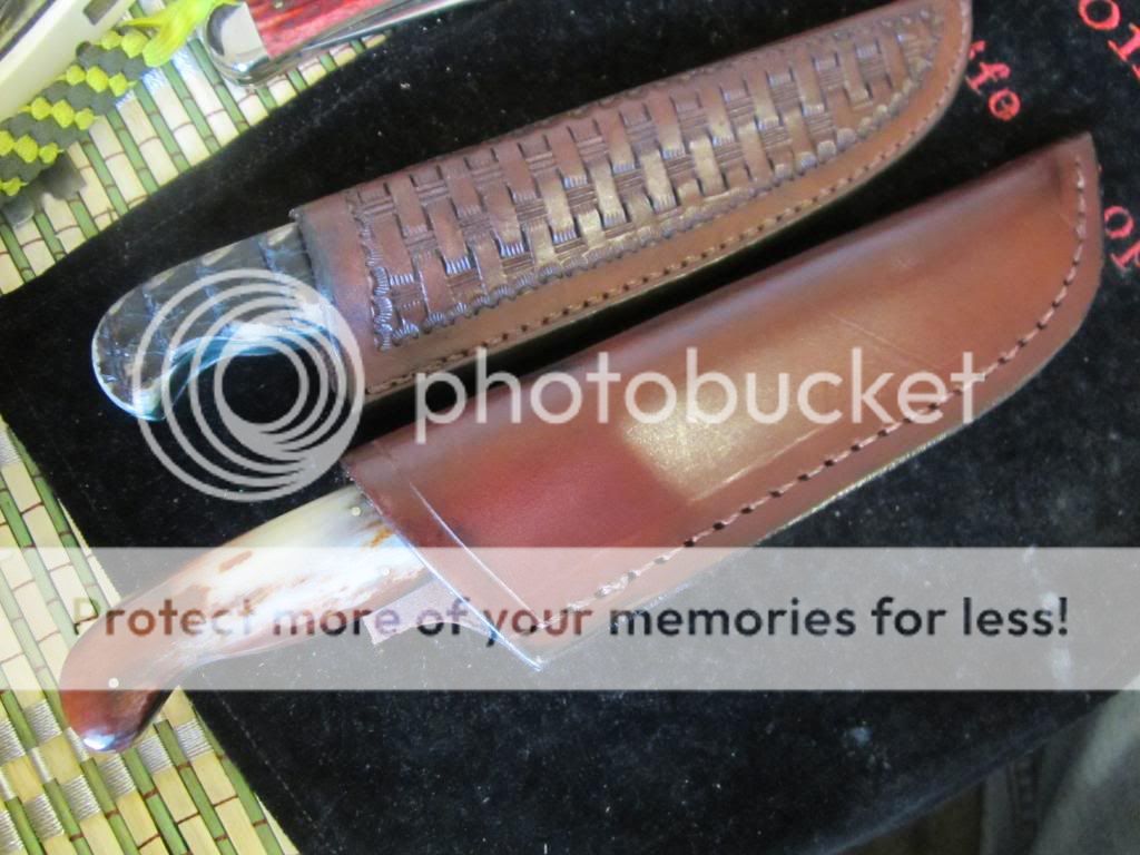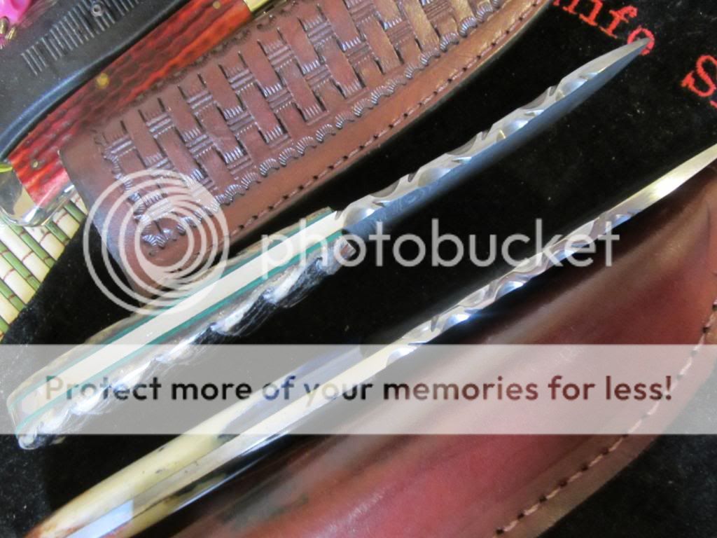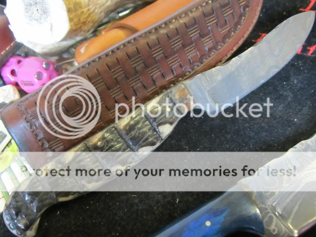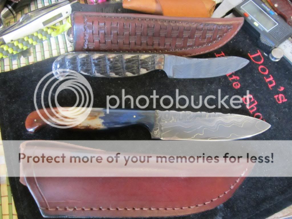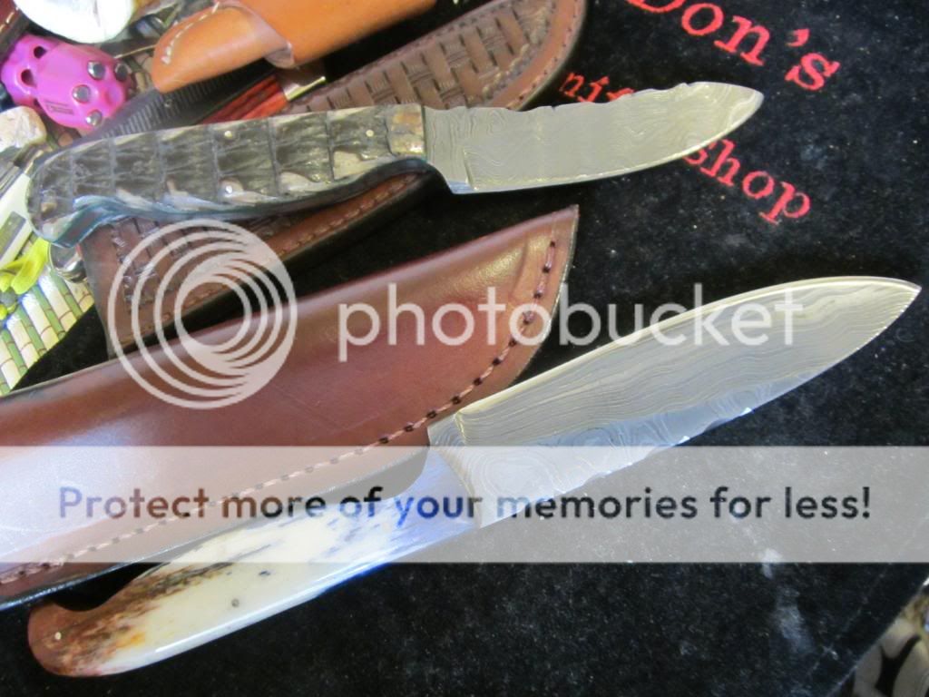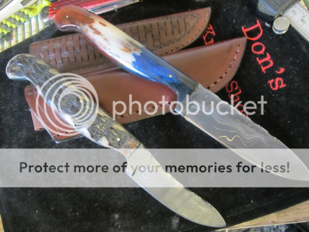 Im selling a couple of Robert Garza Alabama Damascus Skinners.The top one is about 7 3/8 " oal with a 3" blade.It has the Armadillo shell handles with green liners.The larger one is 8 3/8'' with a 4" blade.It has dyed camel bone scales.Garza's handle shaping is very nice and comfortable to hold and use.Both have vine worked blade spines and come with very nice leather sheaths.Both knives are razor sharp,clean,and never used.I need $125 each + $5.00 for shipping.Paypal is fine or postal money order.No added fees.USA only.