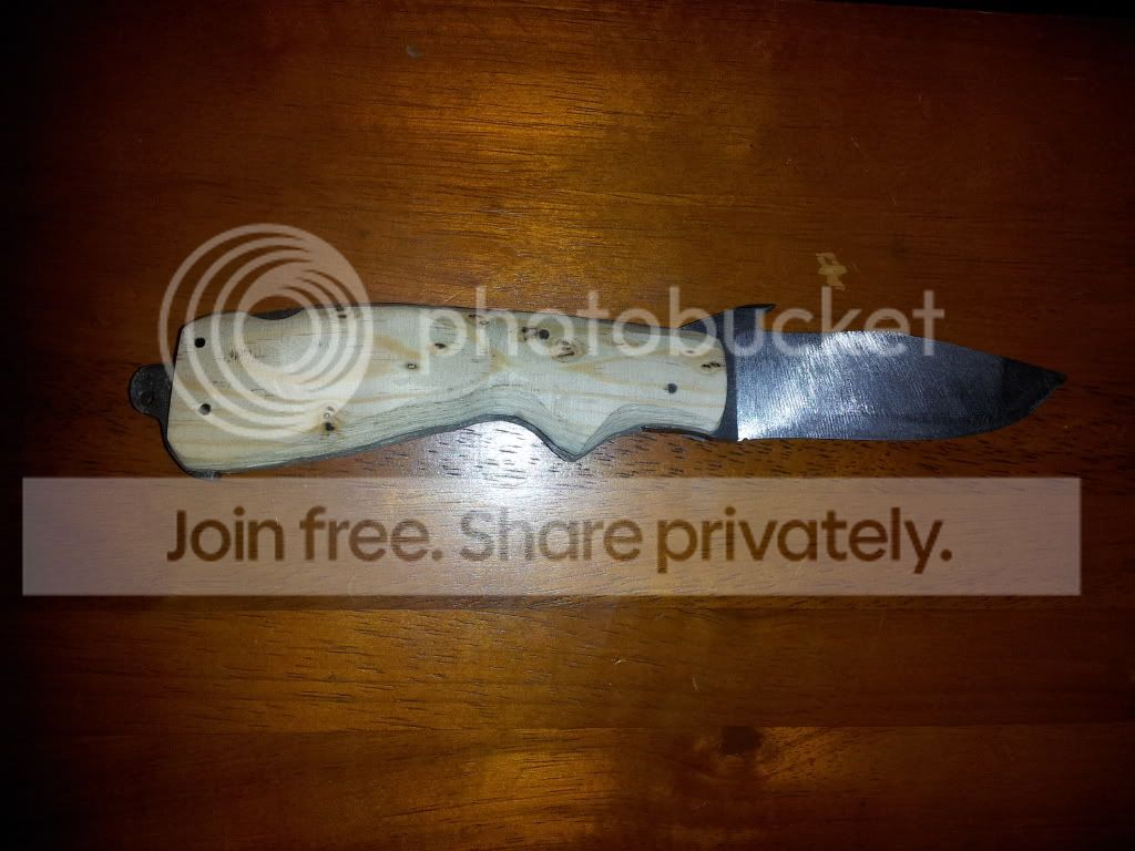 Blade is 5160. Handle is just pine right now, I got impatient and decided to put some shape to the big board I am using for mock up. It will be replaced eventually after I get ht done. I still have a lot of work left. I'm pretty bent on keeping this one. I usually edc coldsteels and wanted to make my own edc this time. If you look at my photobucket you should see progress pics that I have so far. I'm very pleased with my plunge cuts on this one.