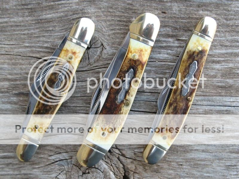 Three knives in the first set. A split spring whittler, a two bladed copperhead pattern, and a slim stockman. All are well build, no gaps, sharp, and quite decent snap for the most part. The stag is average, with the dye coloring in the middle of the handles not quite matching with the torched edges near the bolster pins. Still, not bad. The split spring whittler is a little tight to open on the master, but not bad. The copperhead is really a nice feeling knife, similar to a smaller version of a folding hunter. A slim stockman, looks like a Schrade pattern.