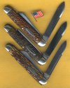 Very nice , particularly like the one on topYou've got it essentially correct, I ISKRA !! There are some variations not worth mentioning here I think! A "junior" cattle knife is less than 3 1/2" closed. Here are three at 3 1/8", two Schrade Cut Cos, and a Schrade Walden.
