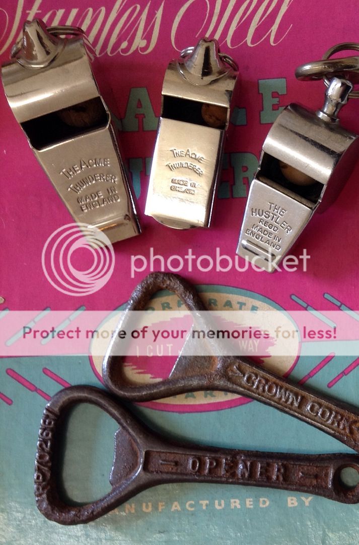 When the allotted hour eventually arrives, I am astonished to see those at the front of the queue actually running for the stalls in their eagerness for a bargain! I amble in, and walk round the rows of stalls, not really seeing much of interest to me. I like the look of an old cleaver I spot, but the asking price is high, and I really have little use for it. On another, I see some old Acme whistles and buy them.