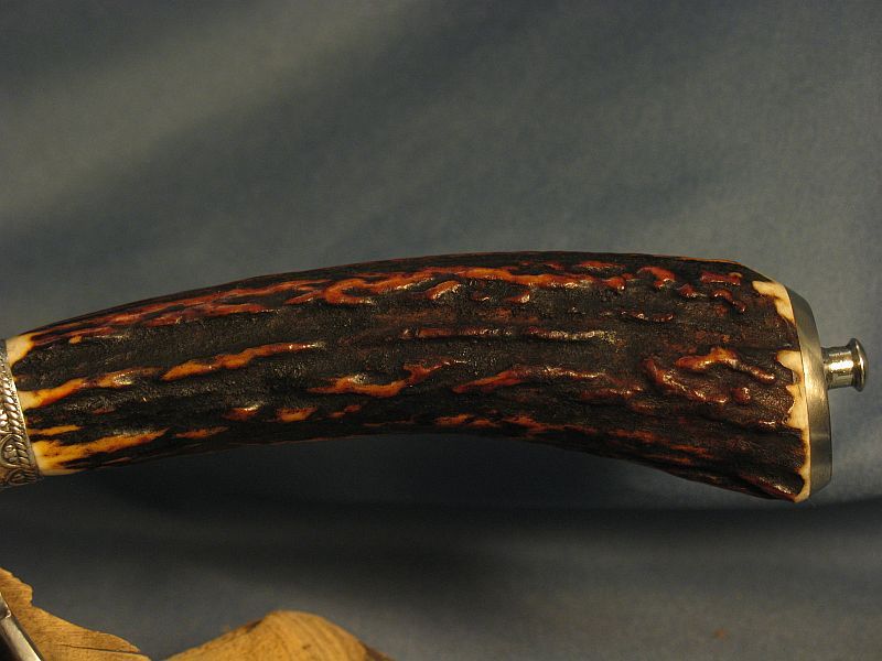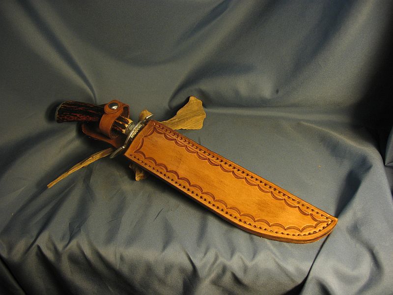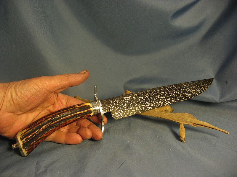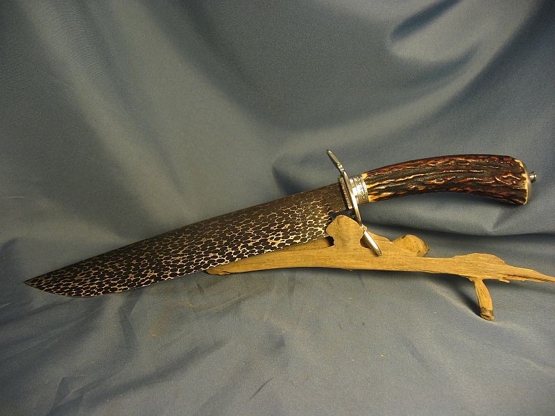 Nice Bowie or fighter with a killer cut of stag. Balanced right in front of the guard. It has a 9 1/8th inch blade and is 14 3/8 inches over all. New Sambar stag that is good for either left or right. Sheath comes with it. I would like "SOLD" for knife and sheath with 8.00 mail in USA. My e-mail and paypal address is dangraves4923@earthlink.net