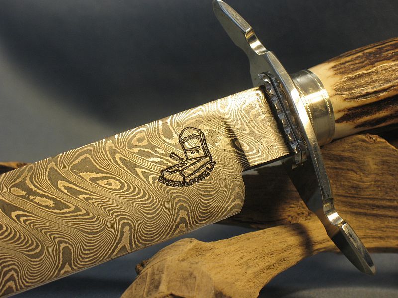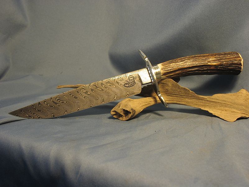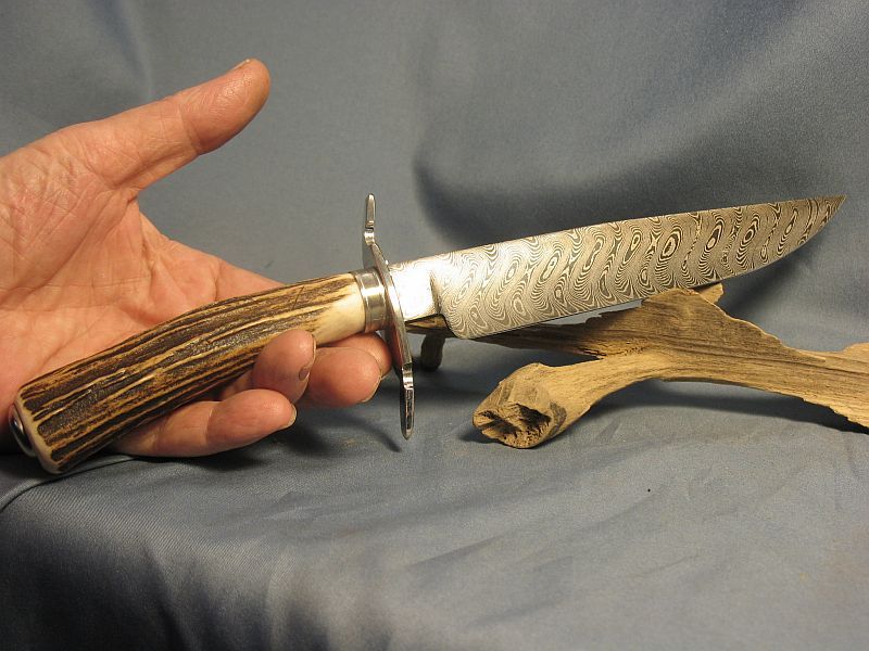 Here is a nice fighter or EDC that I just completed with a new Damascus pattern I call reverse chevrons. Fittings are nickel silver and a fine cut of stag that is good for right or left hand. Well balanced. I made the Damascus out of 1084 and 15n20 steel. Blade length is 7 1/8 inches and overall length is 11 7/8 inches. Comes with sheath.