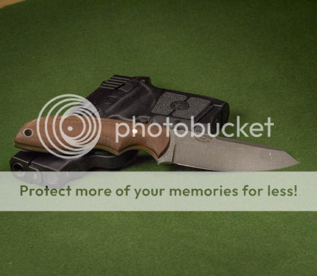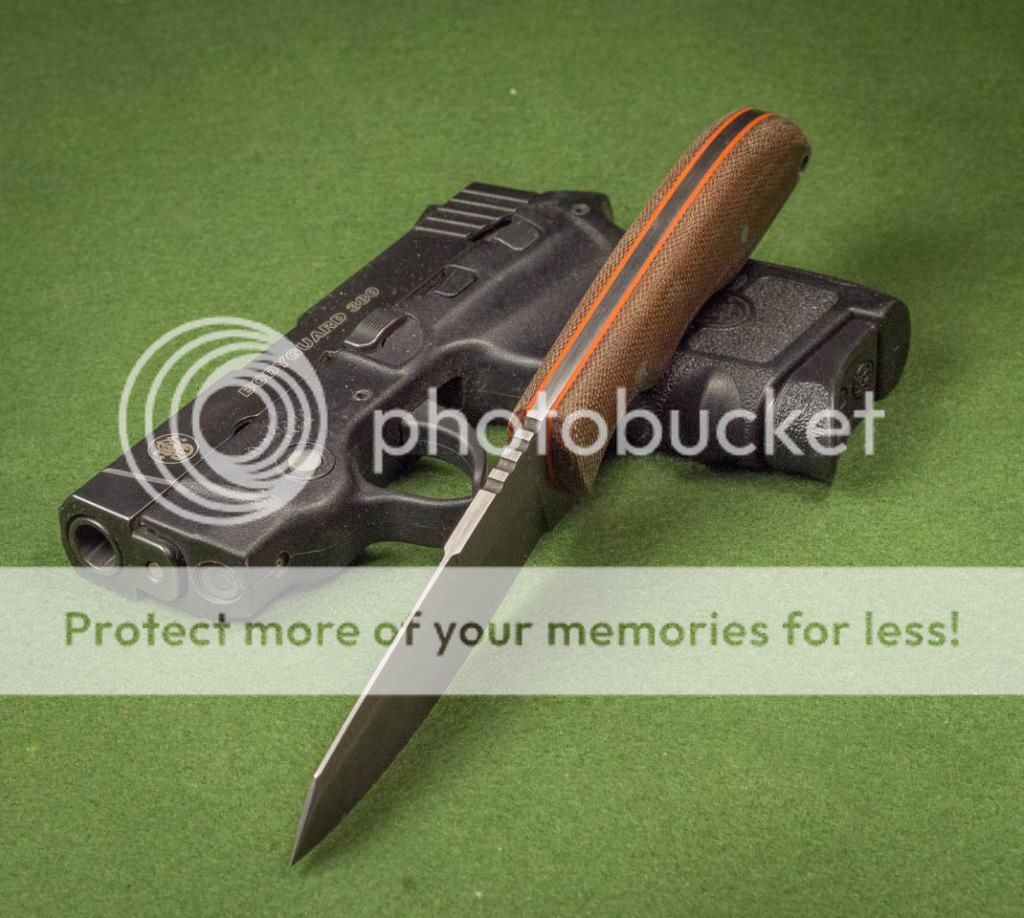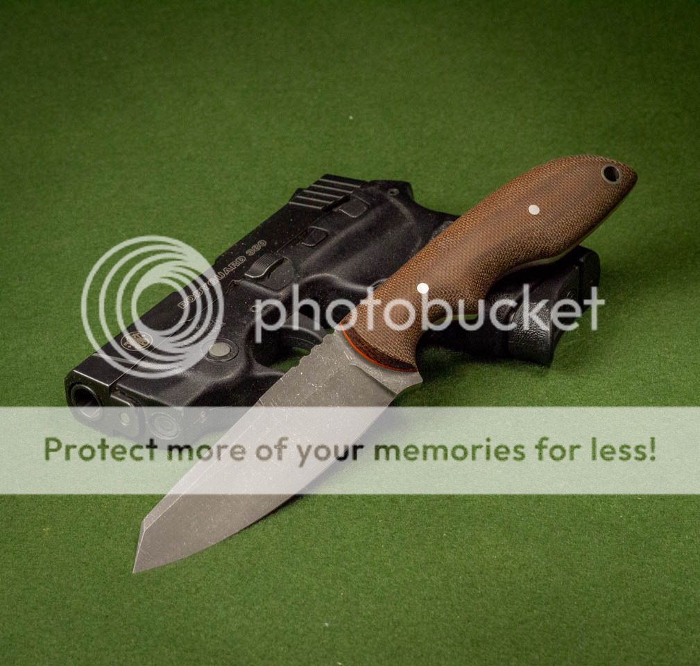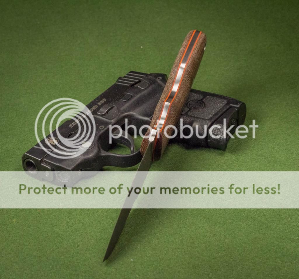 Good afternoon, I have a S-tac up for sale today. It has an ATS34 stainless blade, which has been acid etched and stonewashed. The spine has been left un-etched. The scales are dark brown canvas Micarta with orange G10 spacers. The handle has a very secure grip while still being really comfortable to hold. This knife is available with a Kydex or leather pocket sheath. Thank you for looking, Jeff