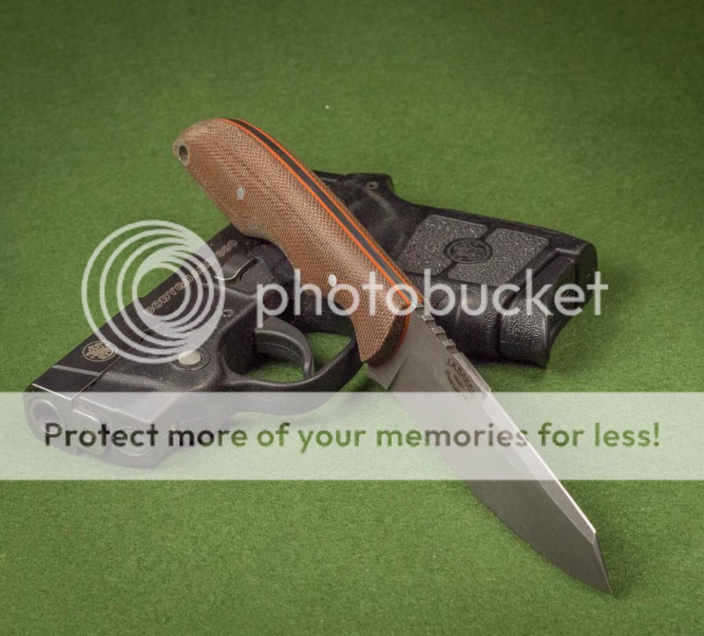 Brown canvas Micarta scales with orange G10 spacers