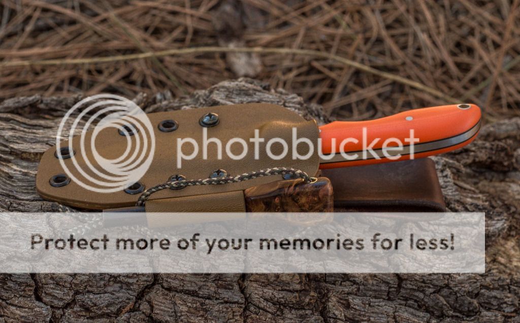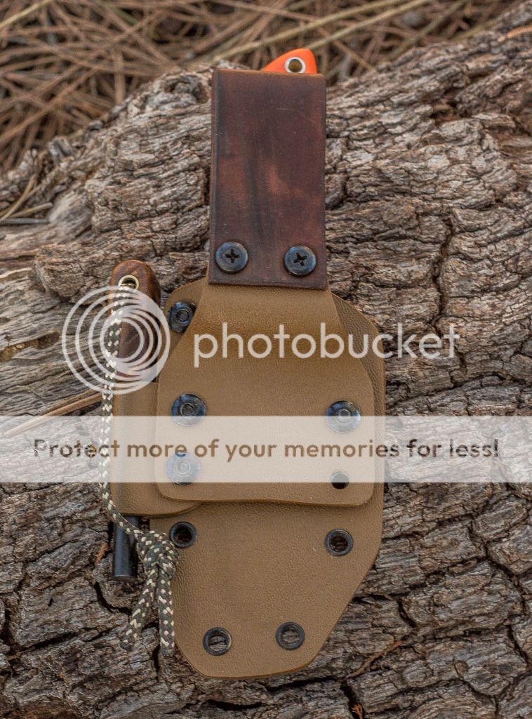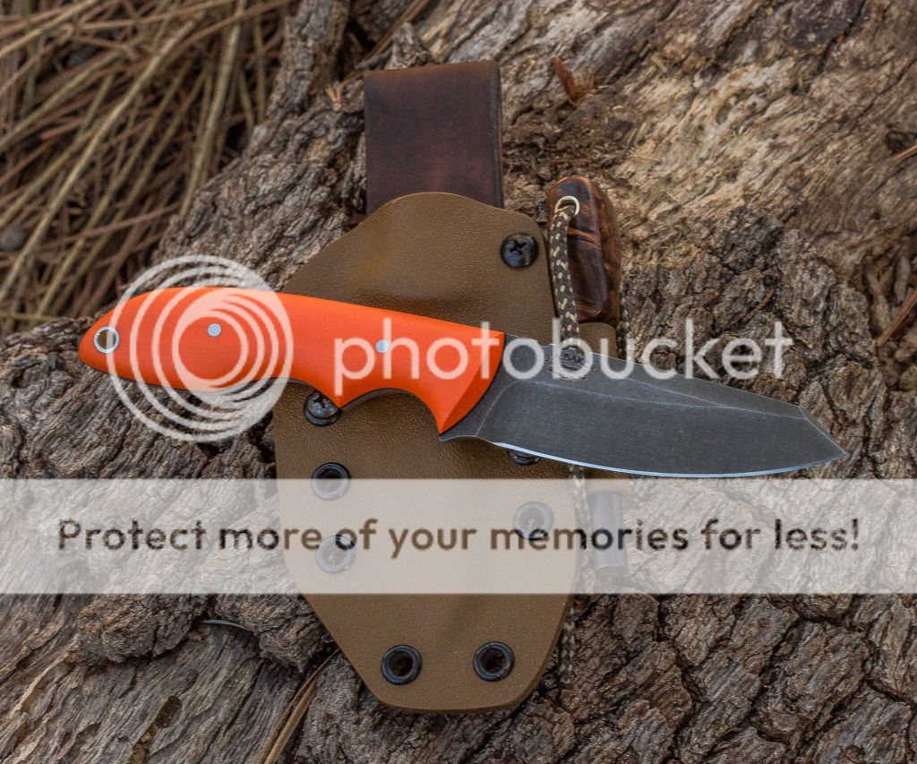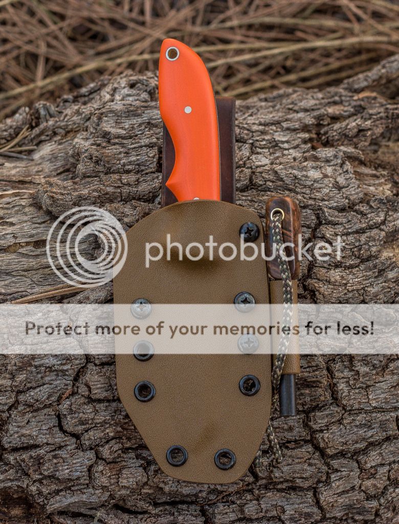 Here is a custom order S-tac I just finished. This one is in 154cm stainless with orange scales and black spacers. The sheath is a hybrid Kydex and leather with dropper and fire steel loop. The firesteel has a stabilized maple burl handle with brass lanyard hole that has been given an ergo shape for comfort. Thanks for looking, Jeff