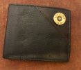 Black soft leather with a real Remington 12 ga. shotgun shell cap on the front