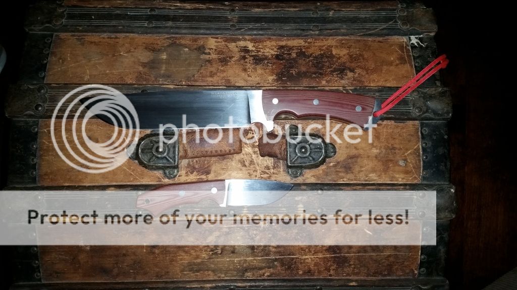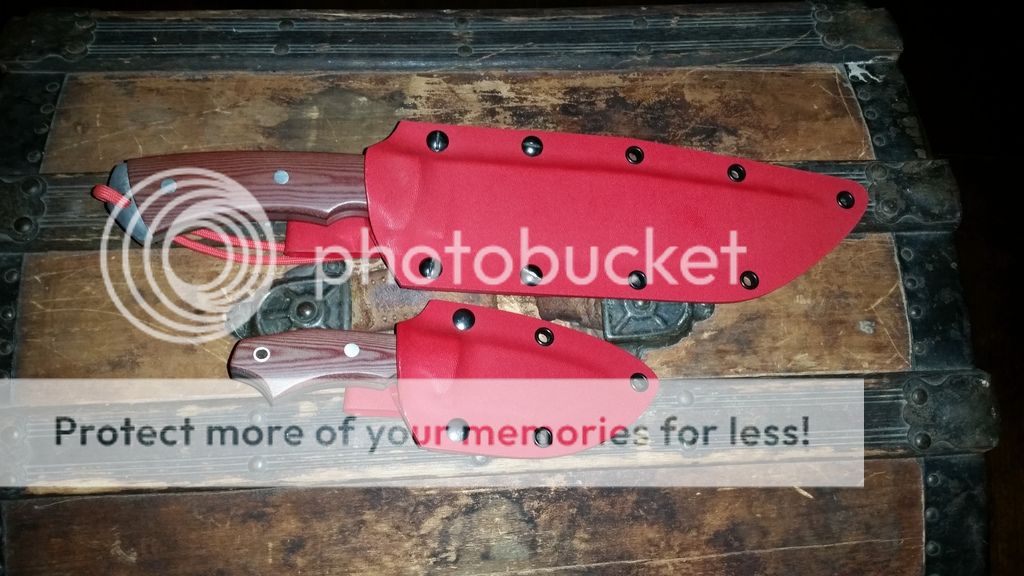 Ray Laconico matched camp pair: 1/4" thick 5160 steel (larger of the two is 8" blade), red micarta scales and red kydex sheathes. Asking SOLD for the pair.