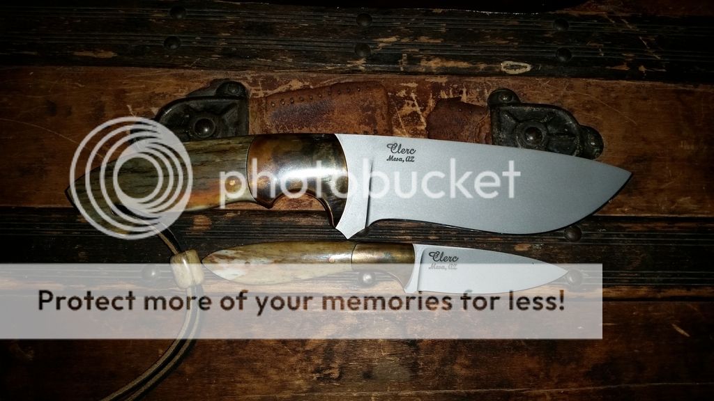 Michael Clerc matched set. S30V steel, giraffe bone scales and copper bolsters with piggy back sheath. - Asking SPF for the pair.