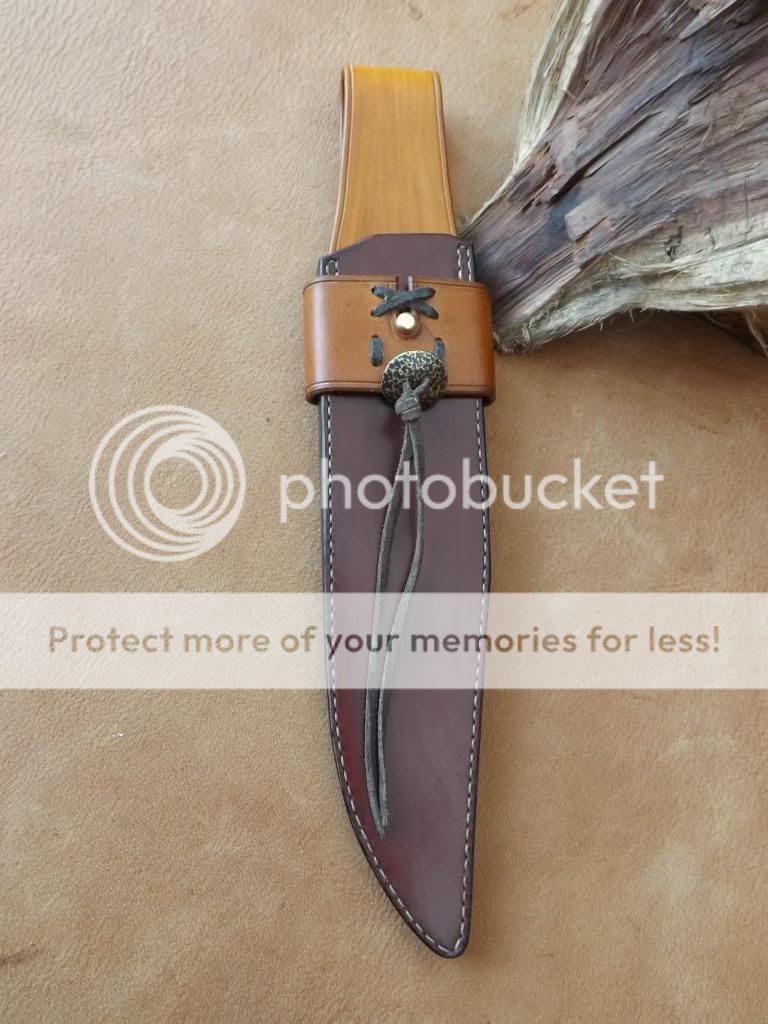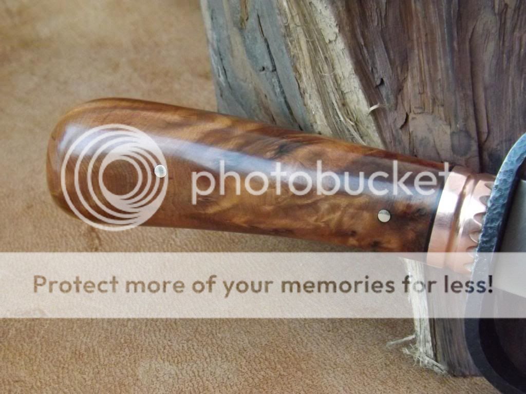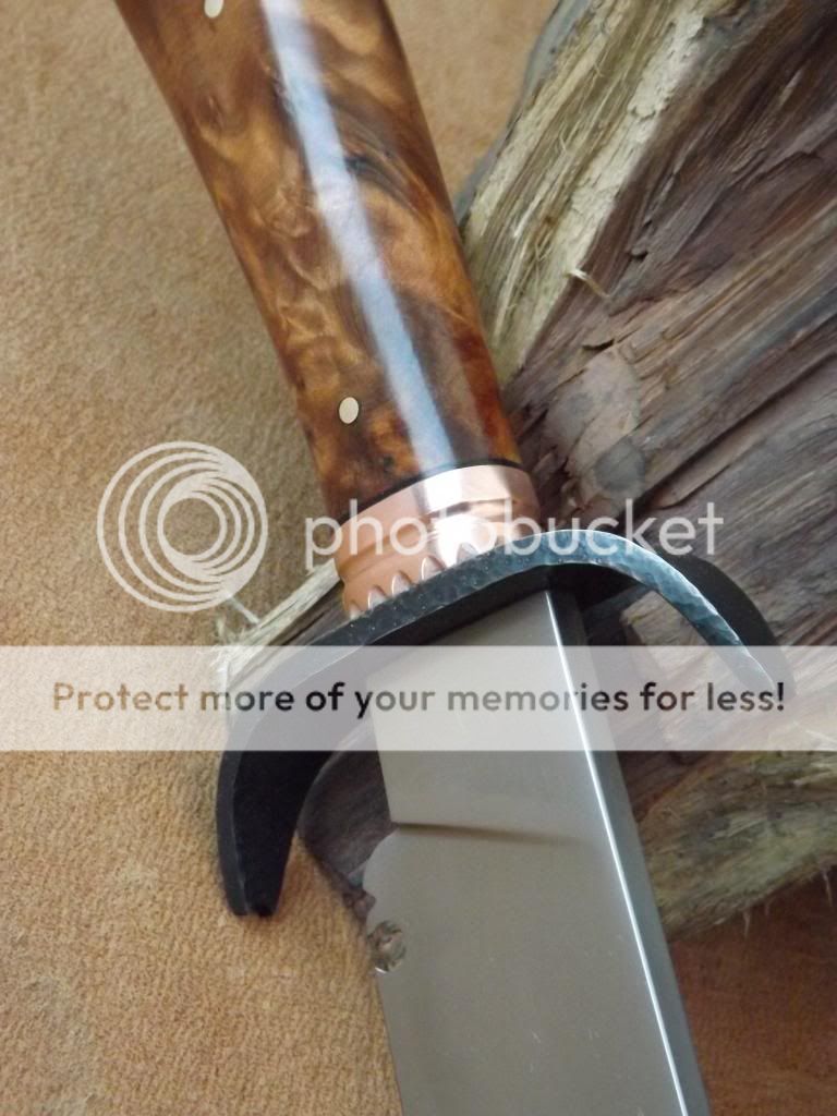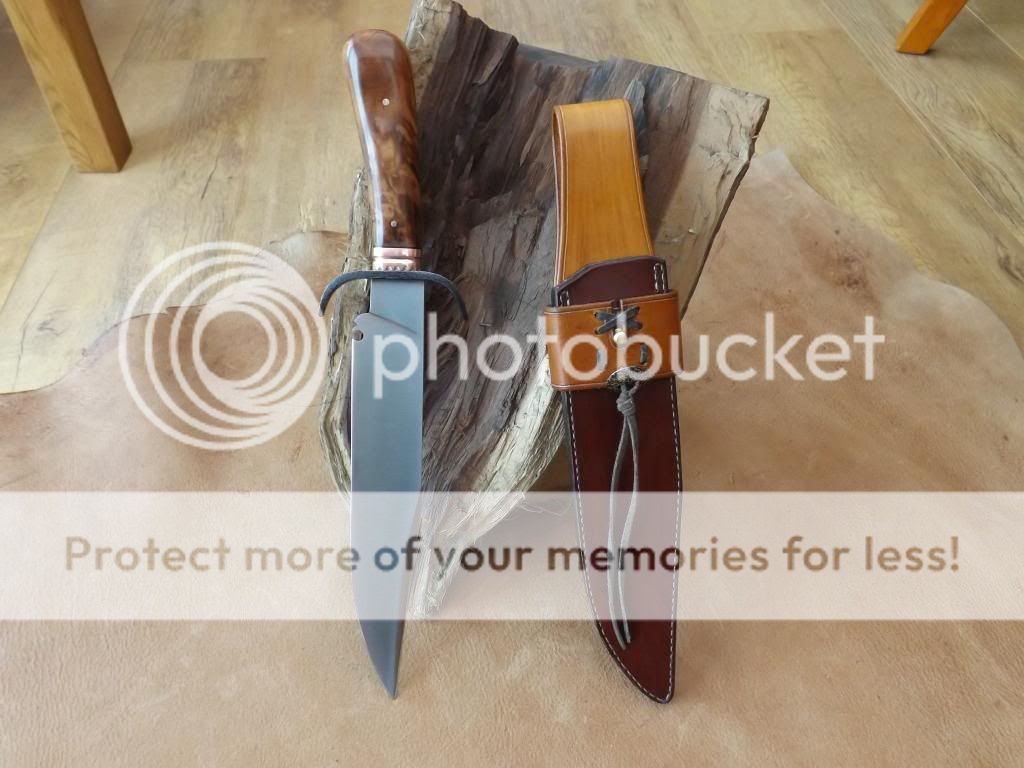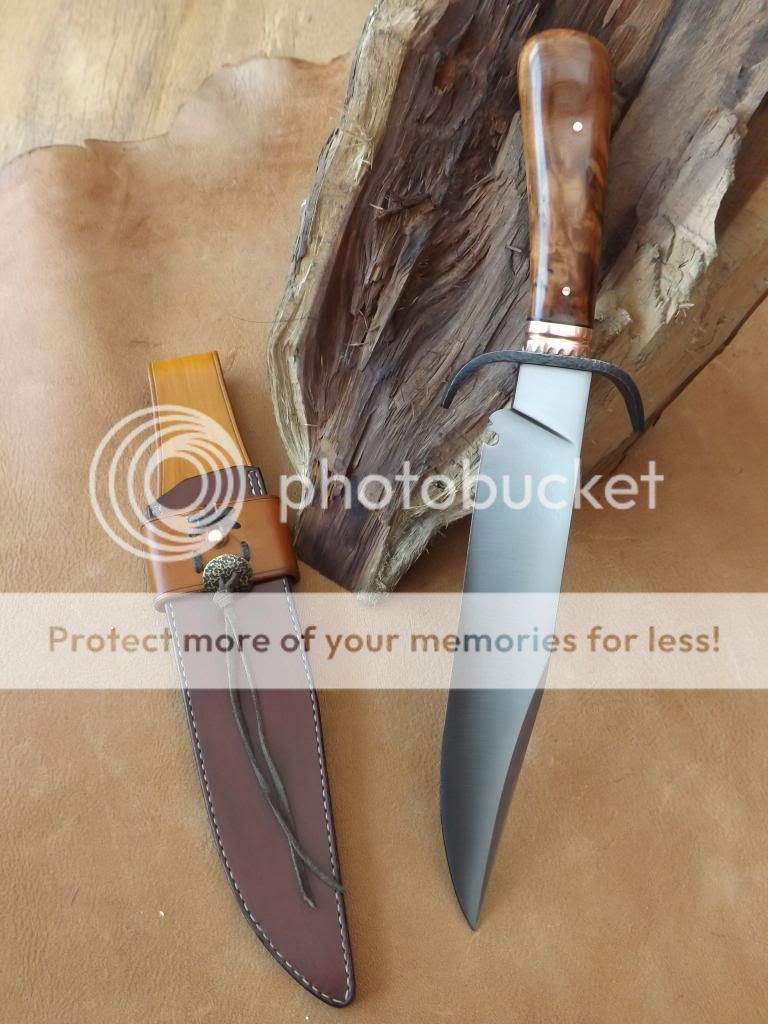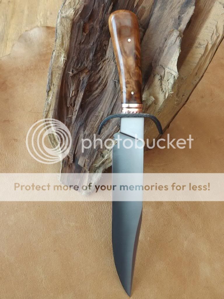 I made this Bowie for a customer earlier in the year. The blade is hand forged from 5160, it's 10" long and about 1/4" thick, the hand guard is low carbon steel forged with hammer marks and gun blued. The bolster is copper with some file work around it's top edge and the handle is Thuya burr held in place with two brass pins. The leahter sheath is made from 1/8" Spanish shoulder which I dye and then hand stitch. I hope you like it.