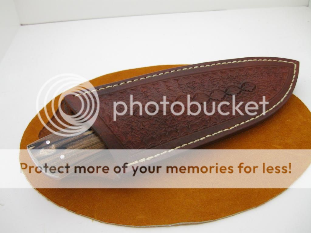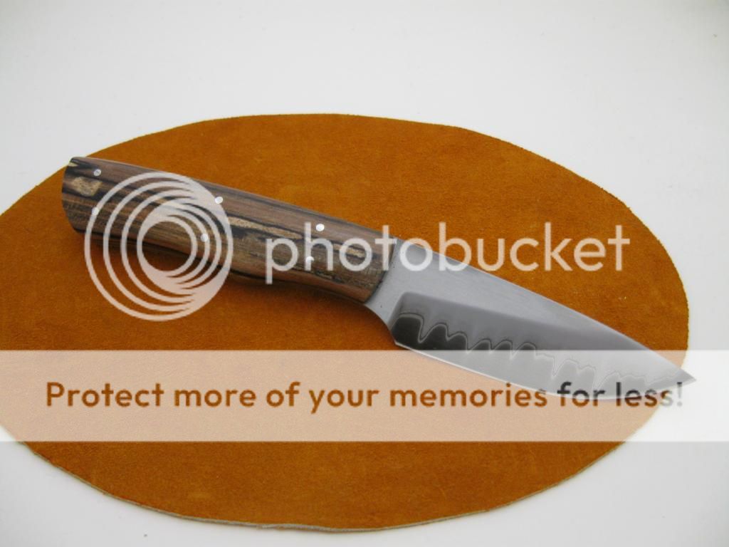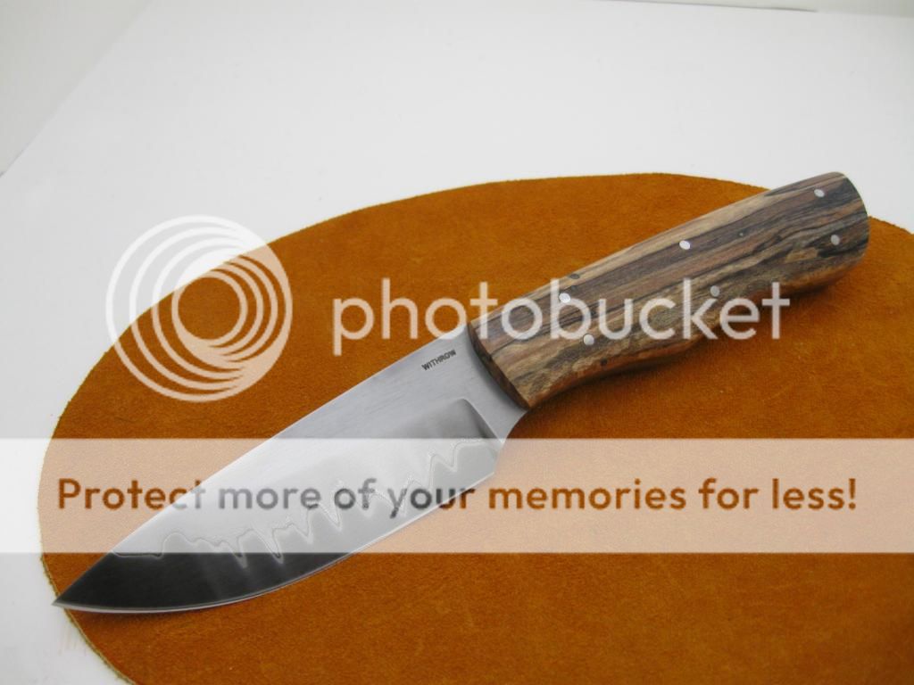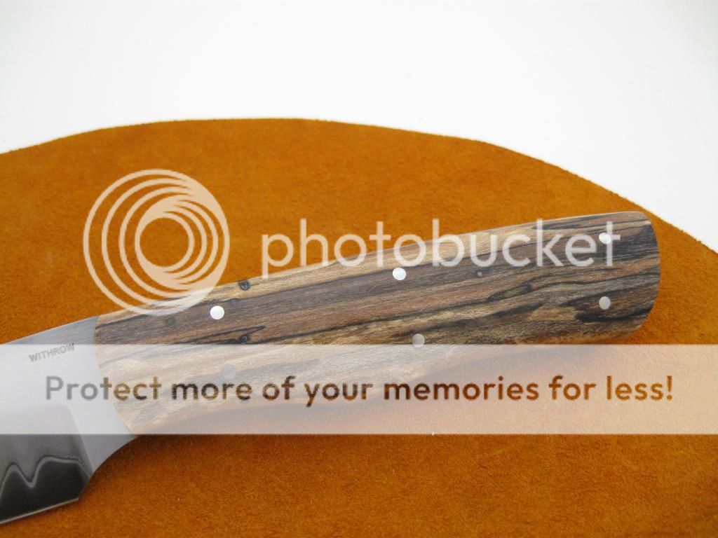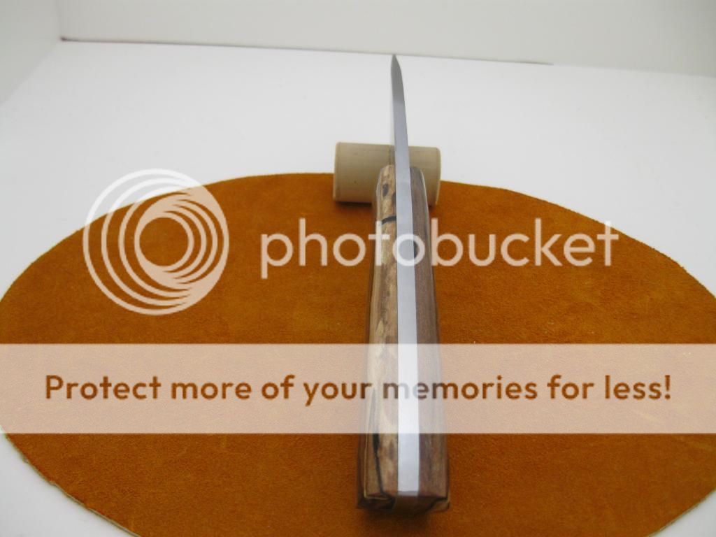 Thickness: .170, handle is stabilized Sycamore with a hand sewn sheath.