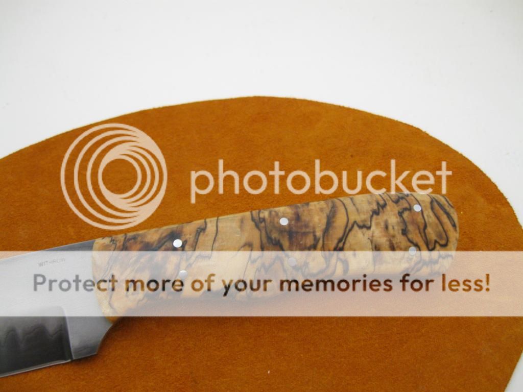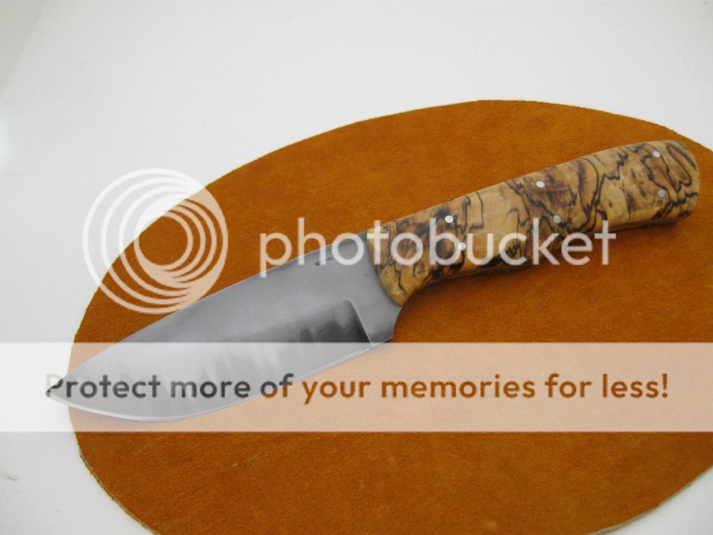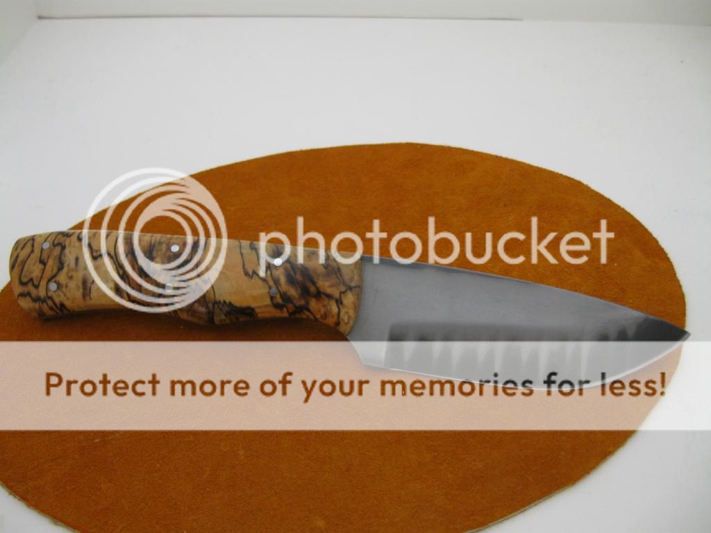 Blade is 416SS forged to 52100. .145 thick at the ricasso. Hand sewn leather sheath.
