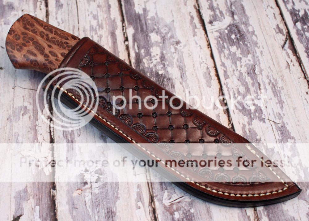 The sheath is 8-9oz hand tooled leather from Wickett and Craig. The knife slides in well and is held securely.