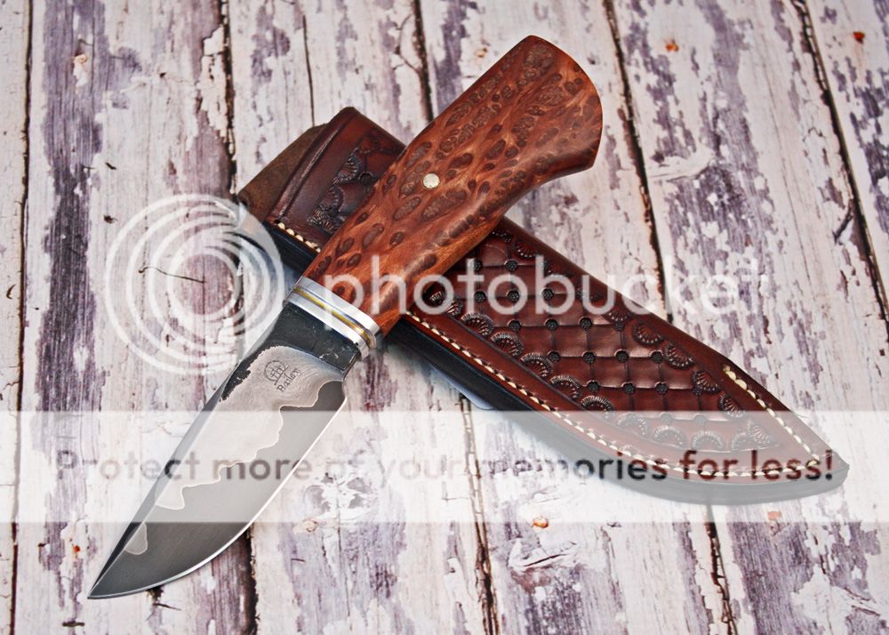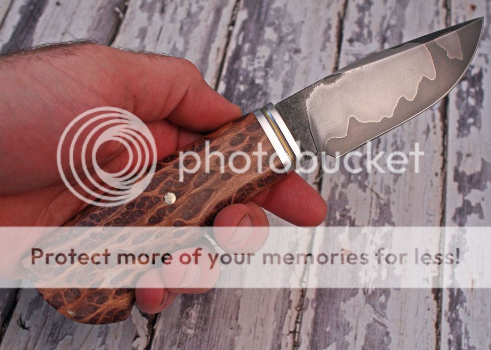 The handle is some really nice stabilized redwood burl. It has really nice figure to it and it seems to move when it catches different light. It has been sculpted to fit the hand really well. The guard is stainless with a brass spacer.