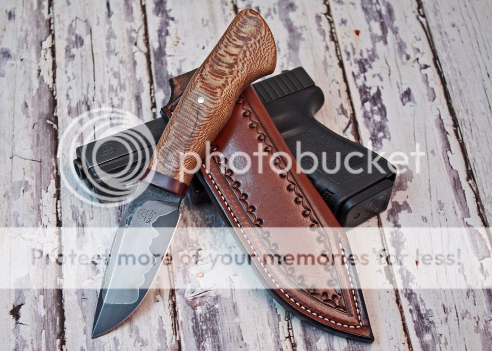 The sheath is 7-8oz hand tooled leather. The knife fits in well and draws easily.