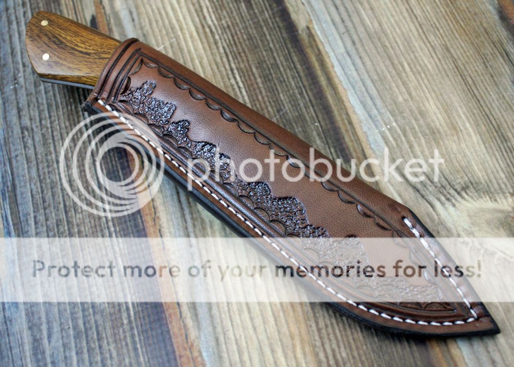 The sheath is 7-8oz hand tooled leather from Wickett and Craig. The knife slips in nicely and is held securely.