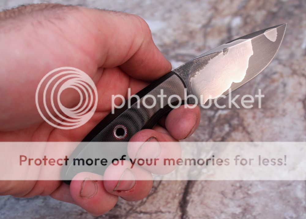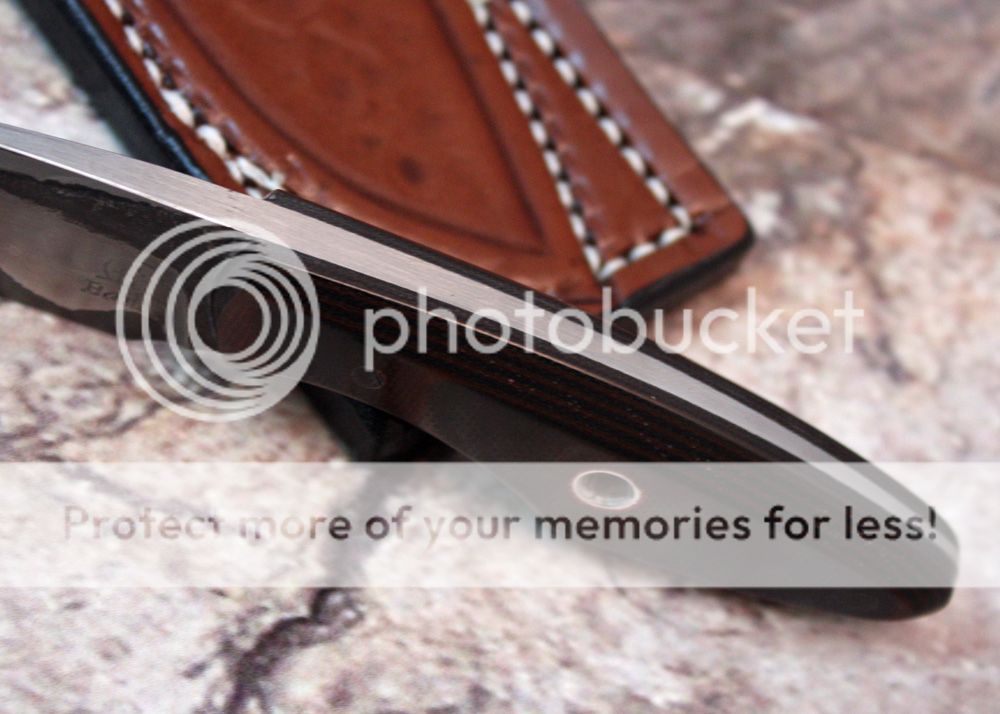 The handle is black and maroon G-10. It is held in place with black micarta pins and one stainless tube. It is chamfered and shaped to fit the hand well.