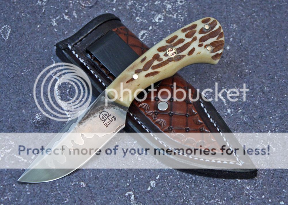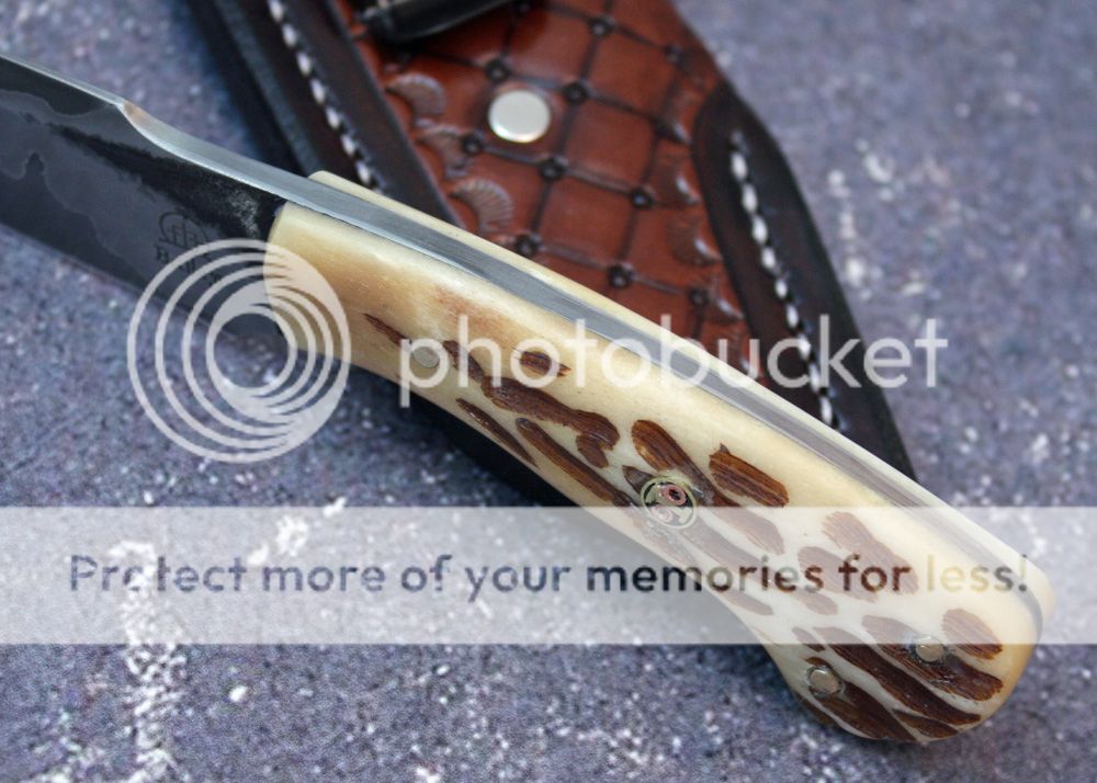 The handle is jigged bone. I jigged it myself and antiqued it. It is held in place with pins and G-flex epoxy.