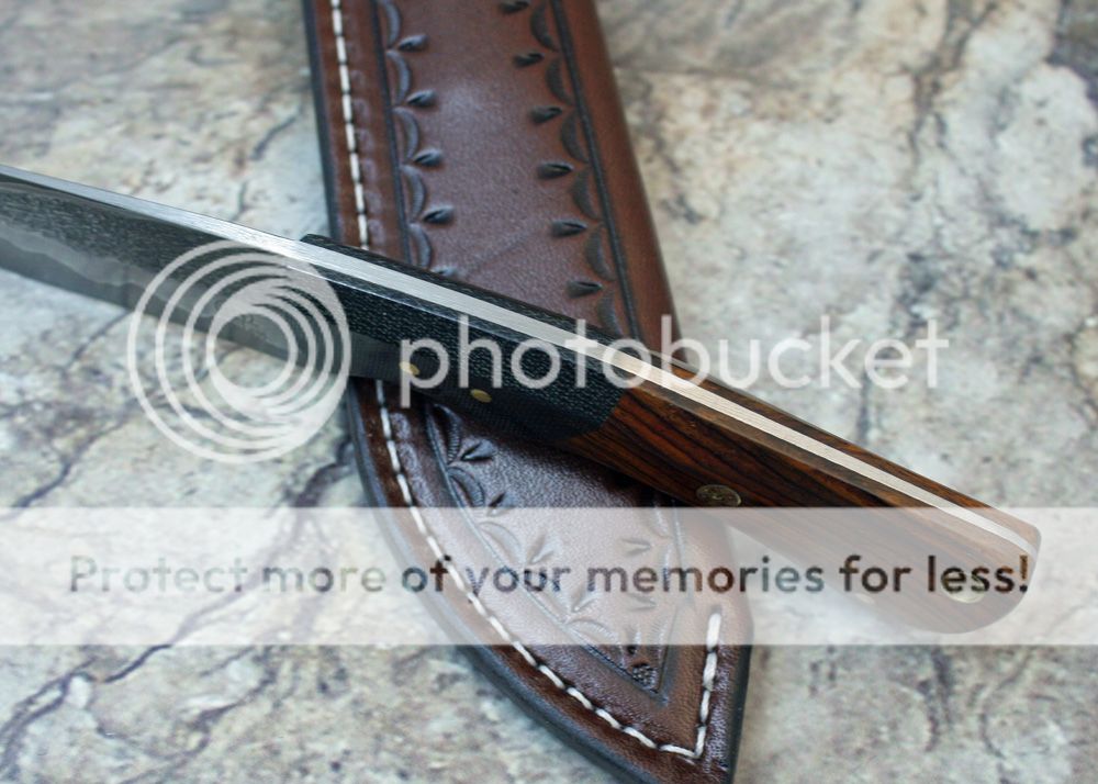 The sheath is 7-8oz hand tooled leather from Wickett and Craig. It holds the knife securely and allows for an easy draw.