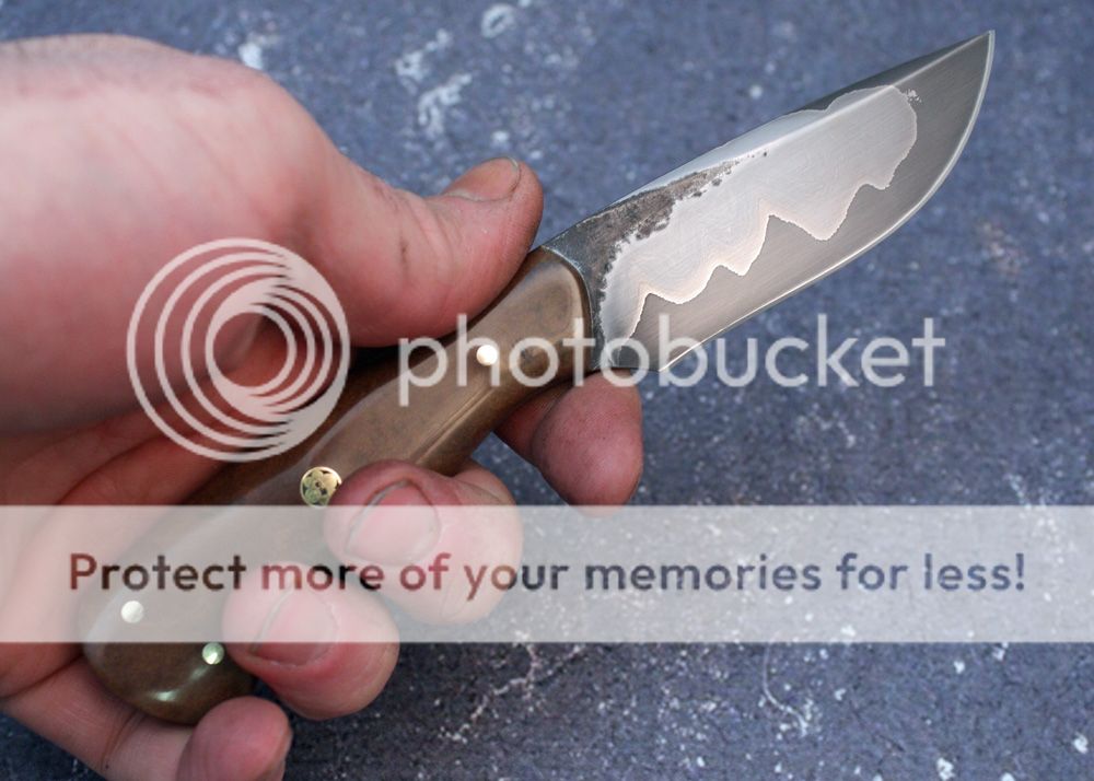 This is some of my san mai. It has Aldo's 1084 for the core steel and high nickel low carbon sandwich layers. It has been hand polished to 800 grit and then etched to bring out the details. It is a razor.