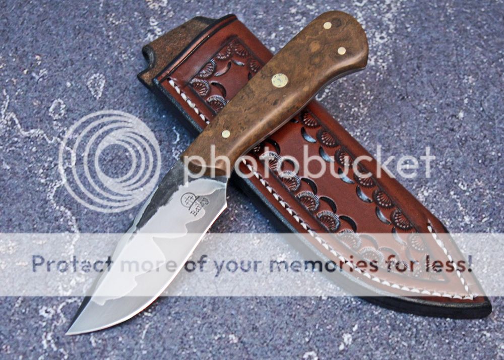 The handle is WIAC (wood in a can). I saw a makers review of Jephco's warwood, which is like micarta, but made with natural materials. On the site they also had WIAC. I thought I would give some a try. It is supposed to look like a burl, which it does. I kinda like it, it was easy to work and has some nice details in it. Anyways, it has been sculpted and shaped to fit the hand and is held in place with pins and G-flex epoxy.