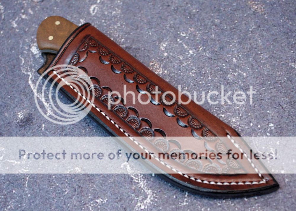 The sheath is 7-8oz leather from Wickett and Craig. It has been hand tooled and designed for this particular knife.