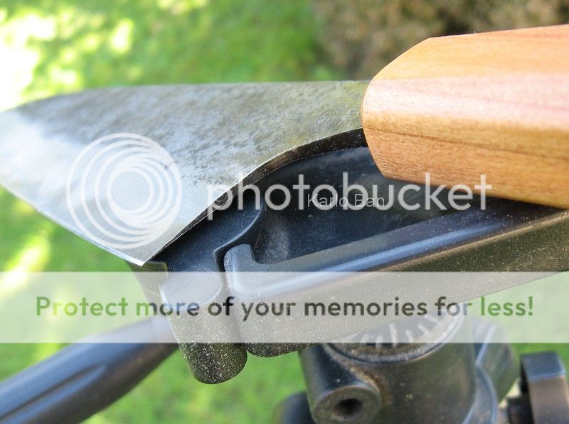 Blade is san mai - silver steel (1.3 %C) and soft iron. Handle is some hardwood not stabilised