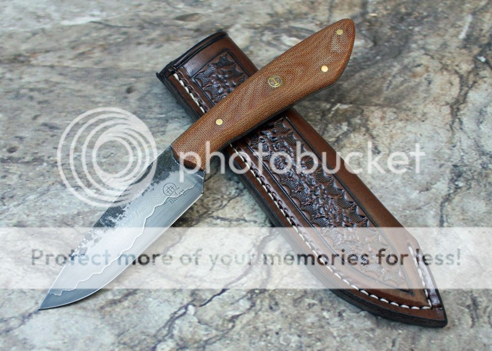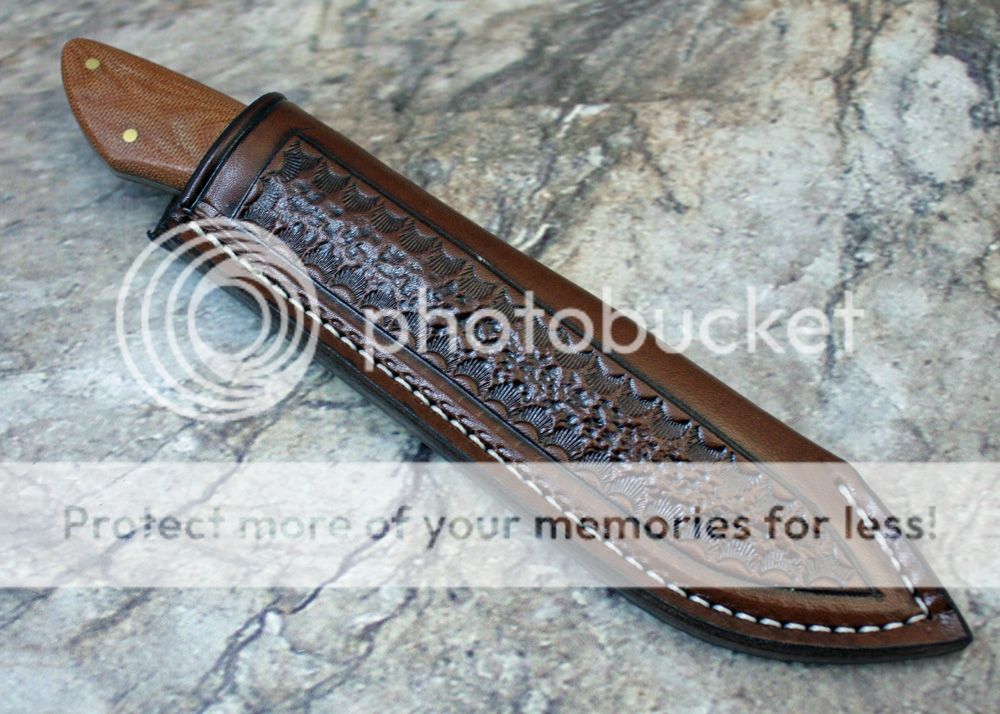 The sheath is 7-8oz hand tooled leather from Wickett and Craig. It holds the knife securely and still draws well.