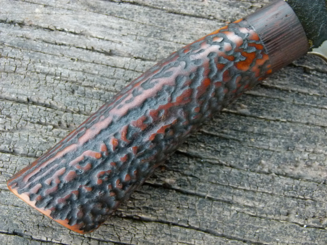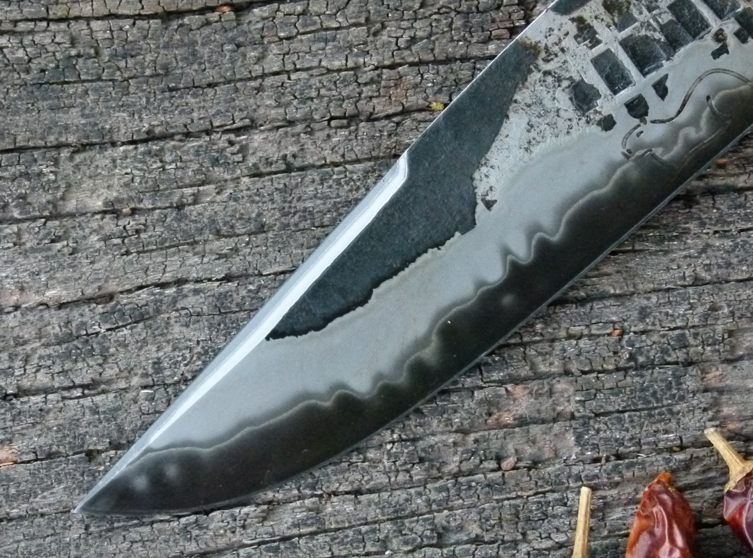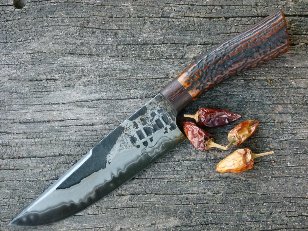 The knife is made of san mai steel with a 1070 steel center and 420 stainless sides, it has a hardness of 58 hrc.
