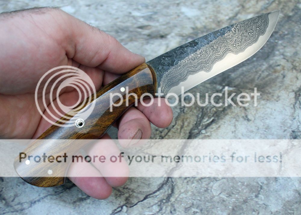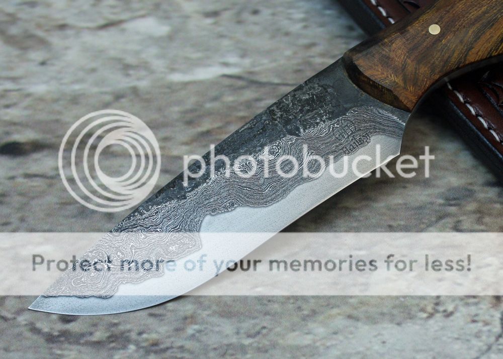 It has been a while since I have had a difficult time putting a knife up for sale. I really like this one and considered keeping it. It is Alabama damascus, forge welded to W2 core. I did the san mai welding, the high layer stuff is done by Alabama Damascus. It has been hand polished to 800 grit and deeply etched.