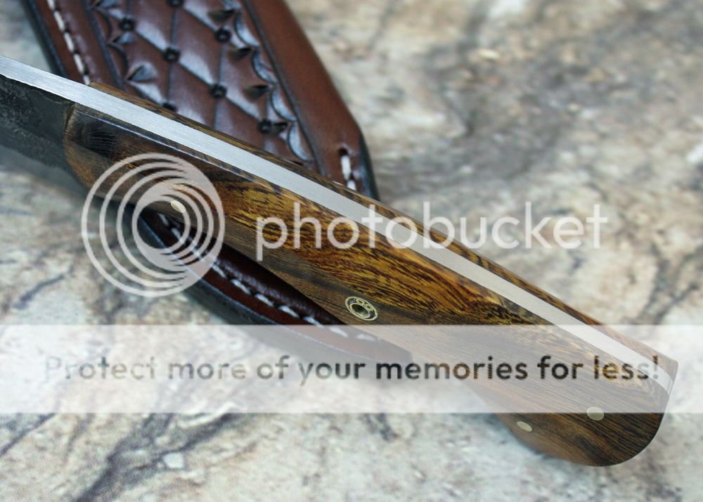 The handle is Desert Ironwood. It is sanded and polished. It has beveled faces and each are polished to 1000 grit before buffing. It is very comfortable in the hand. It is held in place with pins and G-flex epoxy.