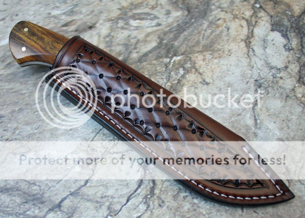 The sheath is 7-8oz hand tooled leather. The leather is from Wickett and Craig. It is specifically designed for this knife. It fits snugly and draws easily.